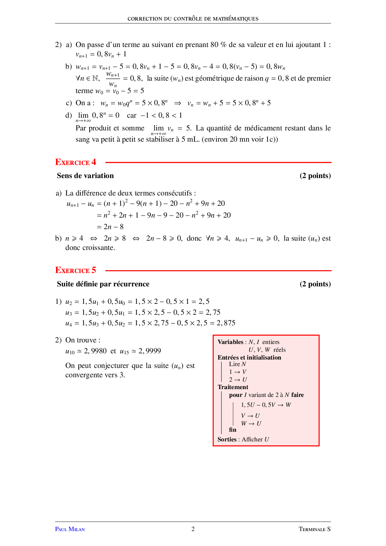 Rappels sur les suites - Corrigé devoir 3