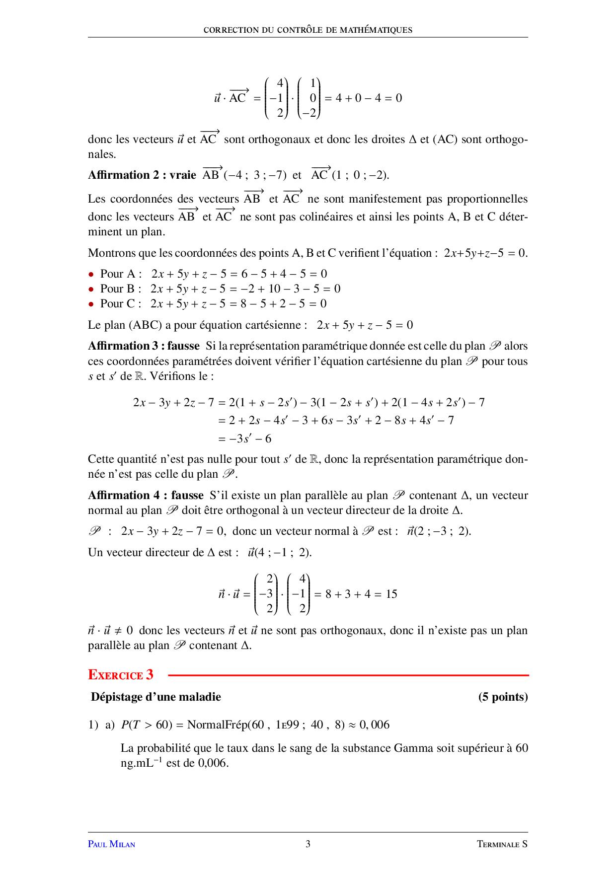 Géométrie dans l'espace et produit scalaire - Corrigé devoir 3