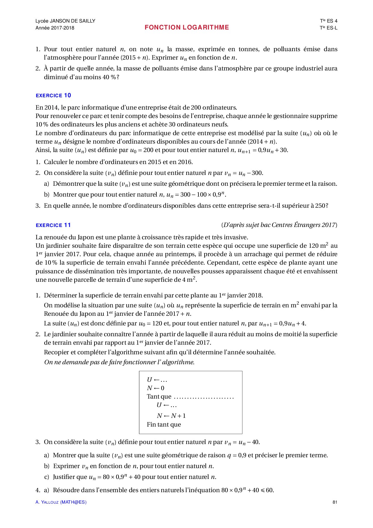 Fonction logarithme - Exercices non corrigés