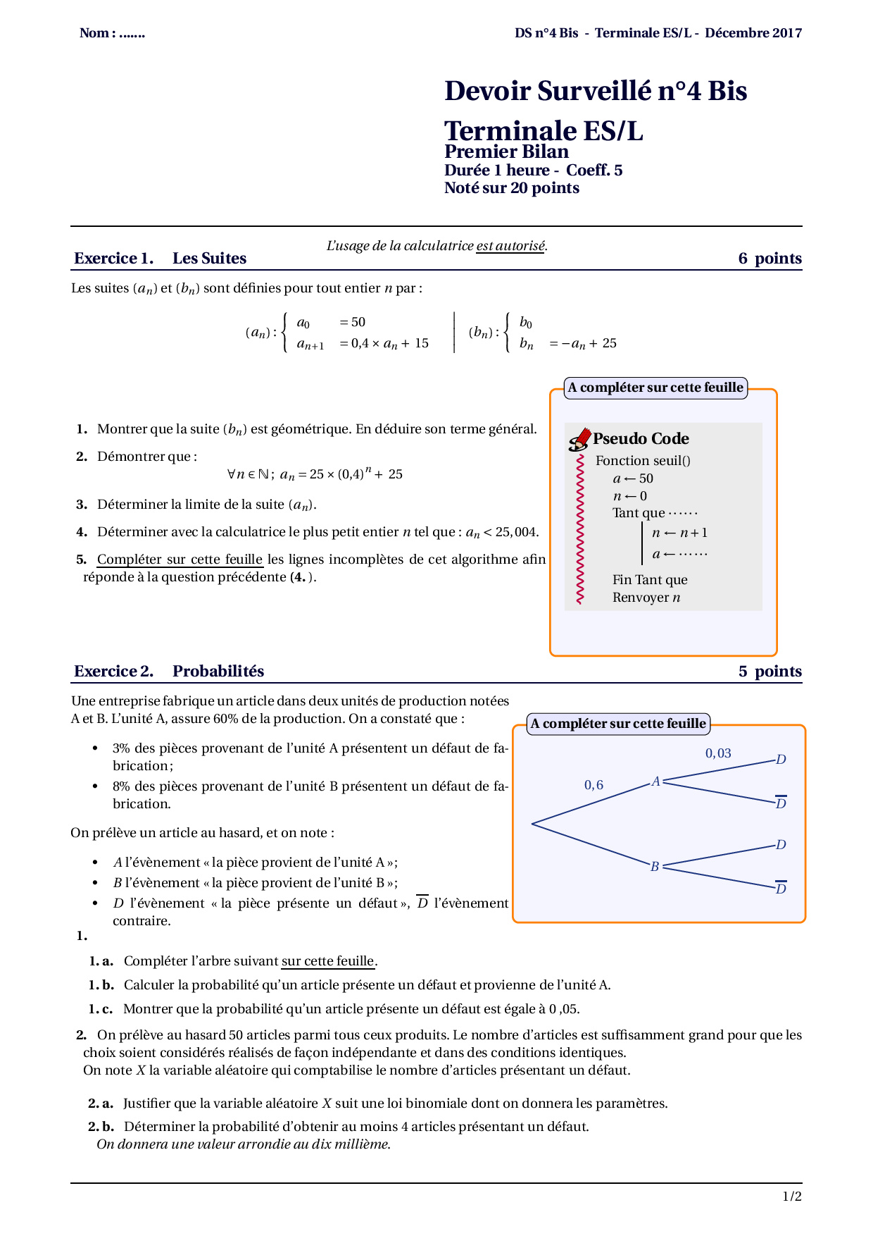Devoir 9 (Fonction exponentielle, suites et probabilités)