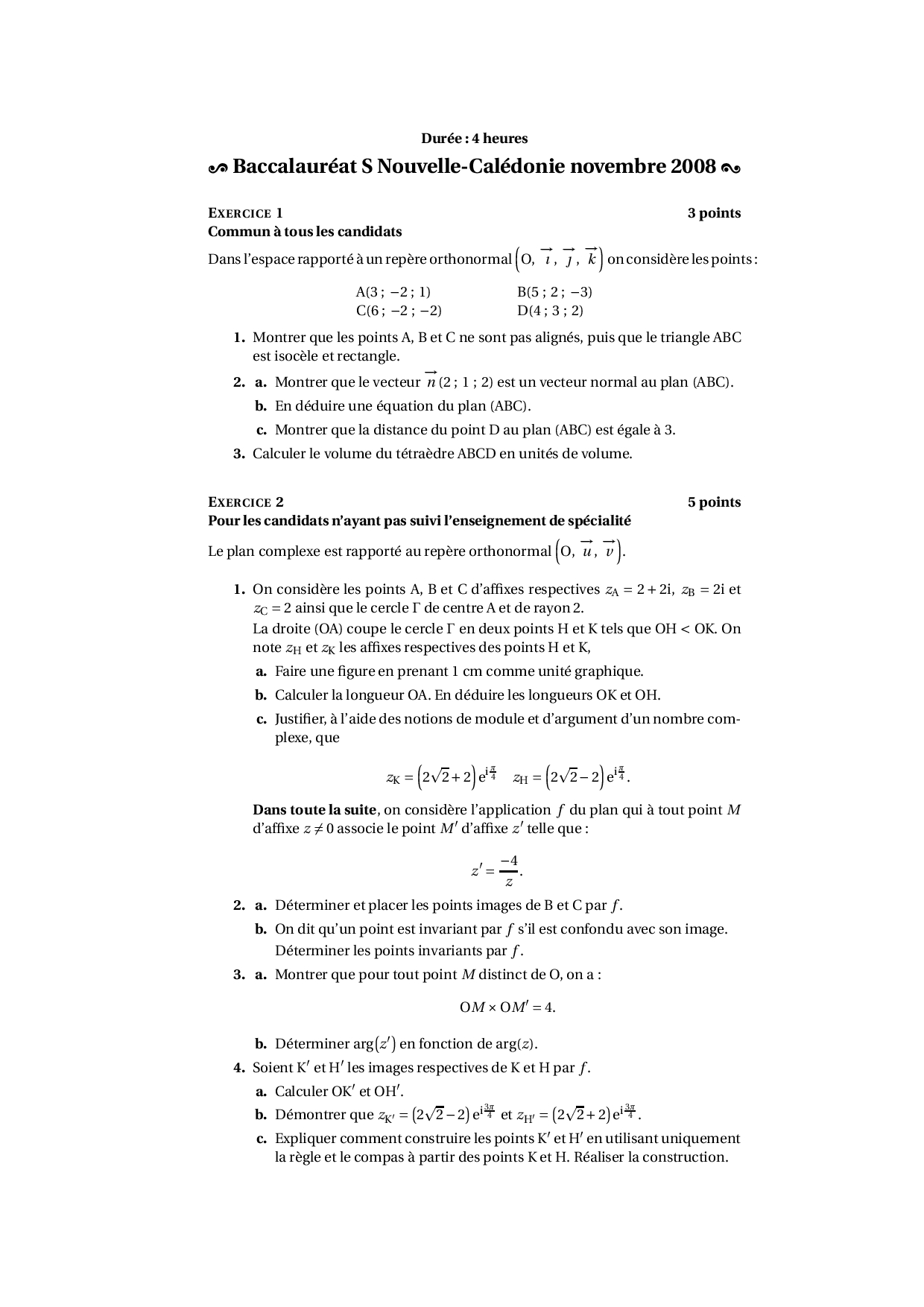 Annale Maths Bac S Nouvelle-Calédonie décembre 2008 - Sujet