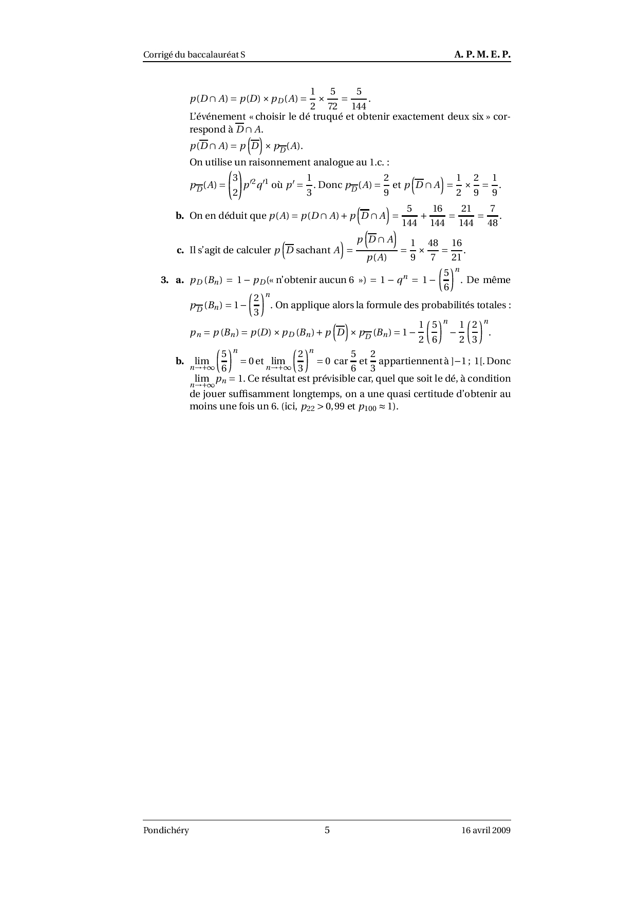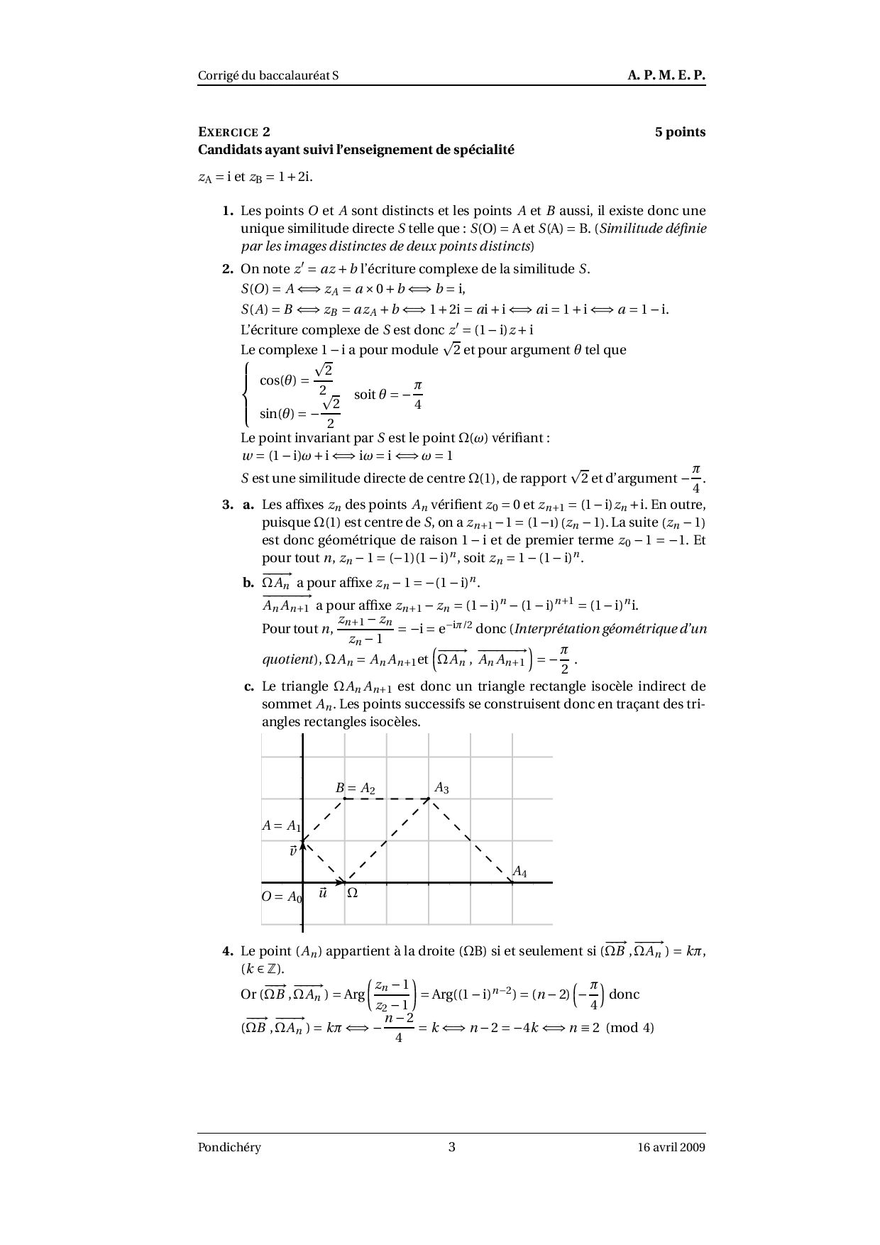 Annale Maths Bac S Pondichéry avril 2009 - Corrigé
