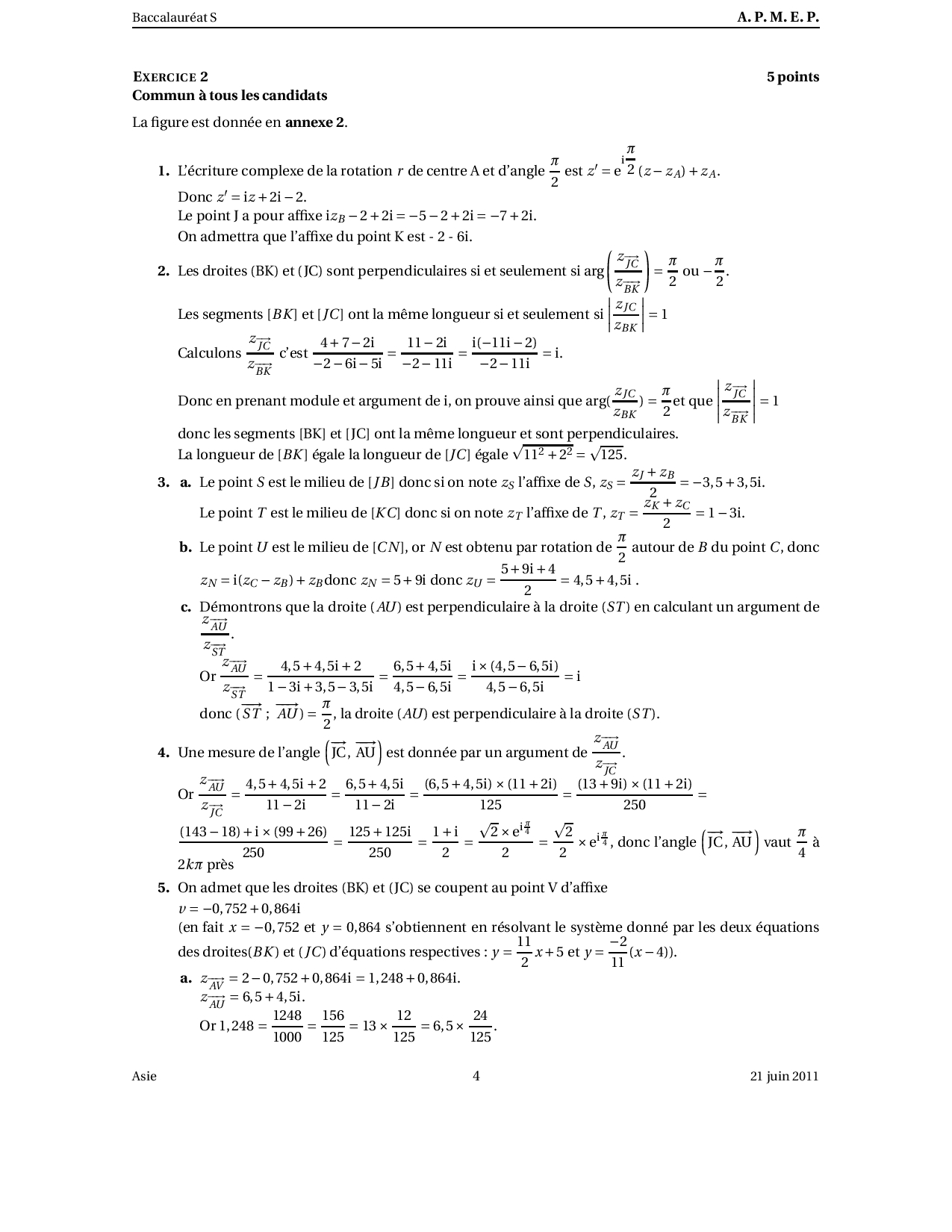 Annale Maths Bac S Asie juin 2011 - Corrigé