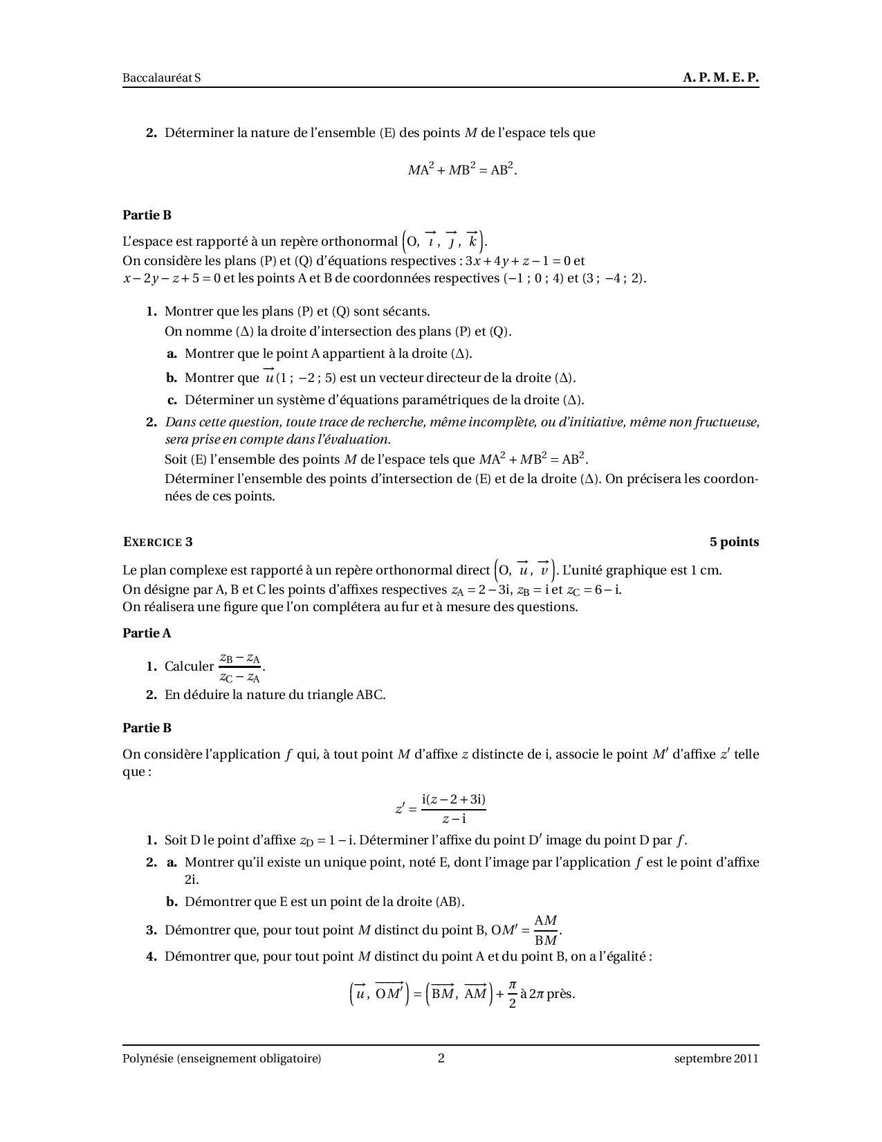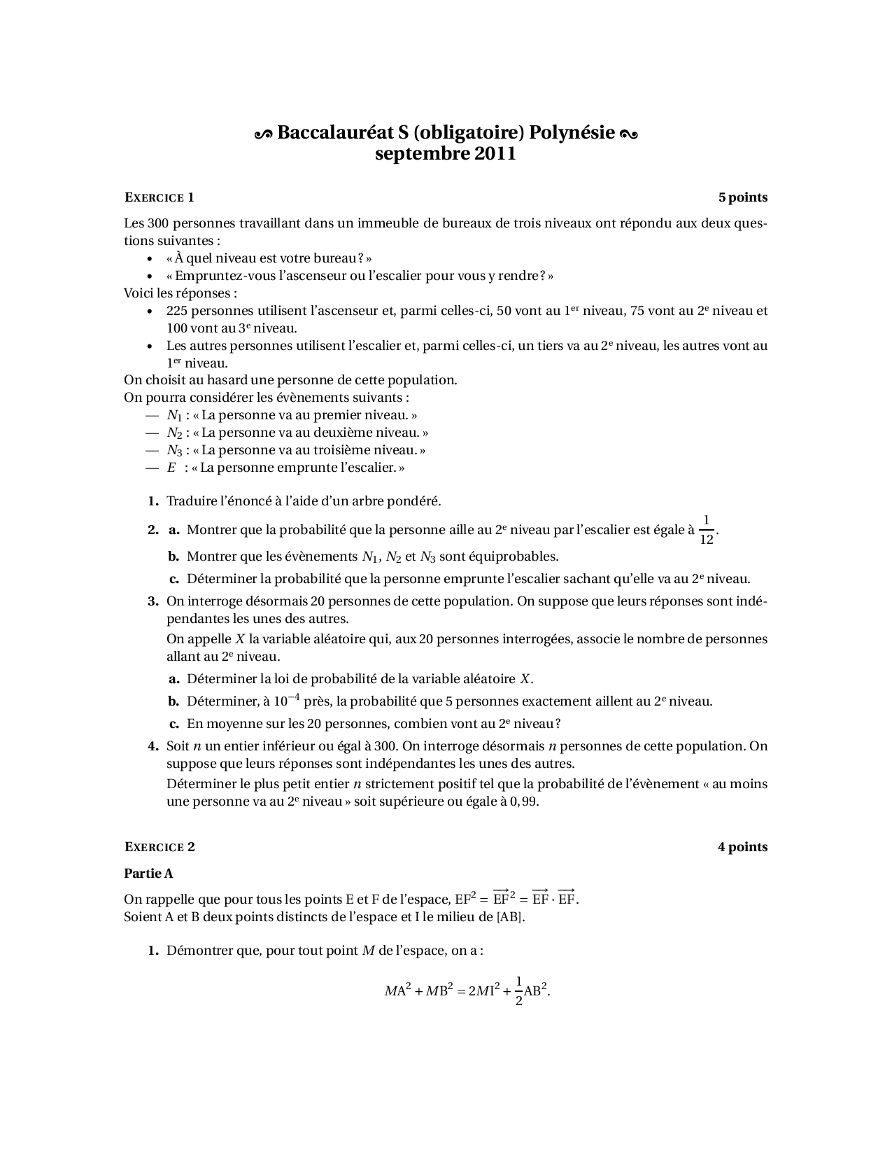 Annale Maths Bac S Polynésie (obligatoire) septembre 2011 - Sujet