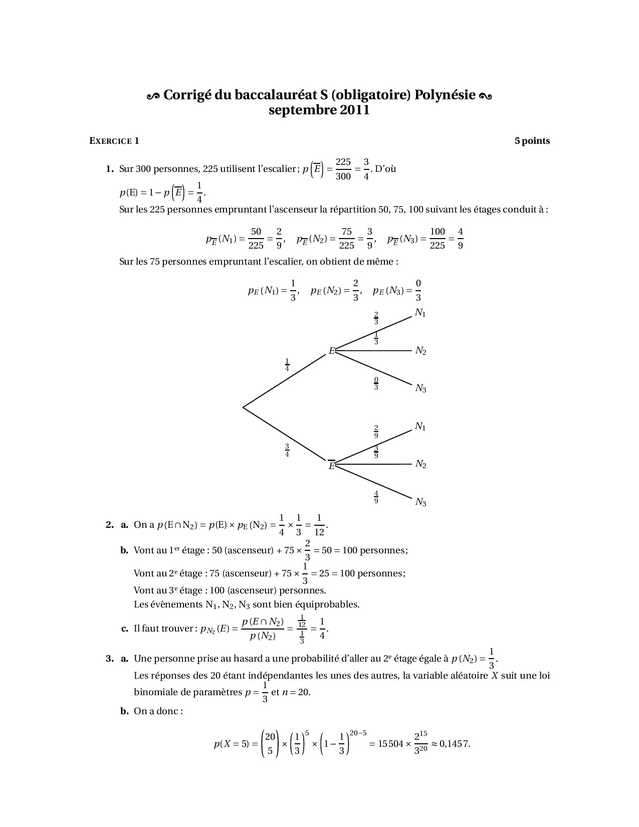 Annale Maths Bac S Polynésie (obligatoire) septembre 2011 - Corrigé
