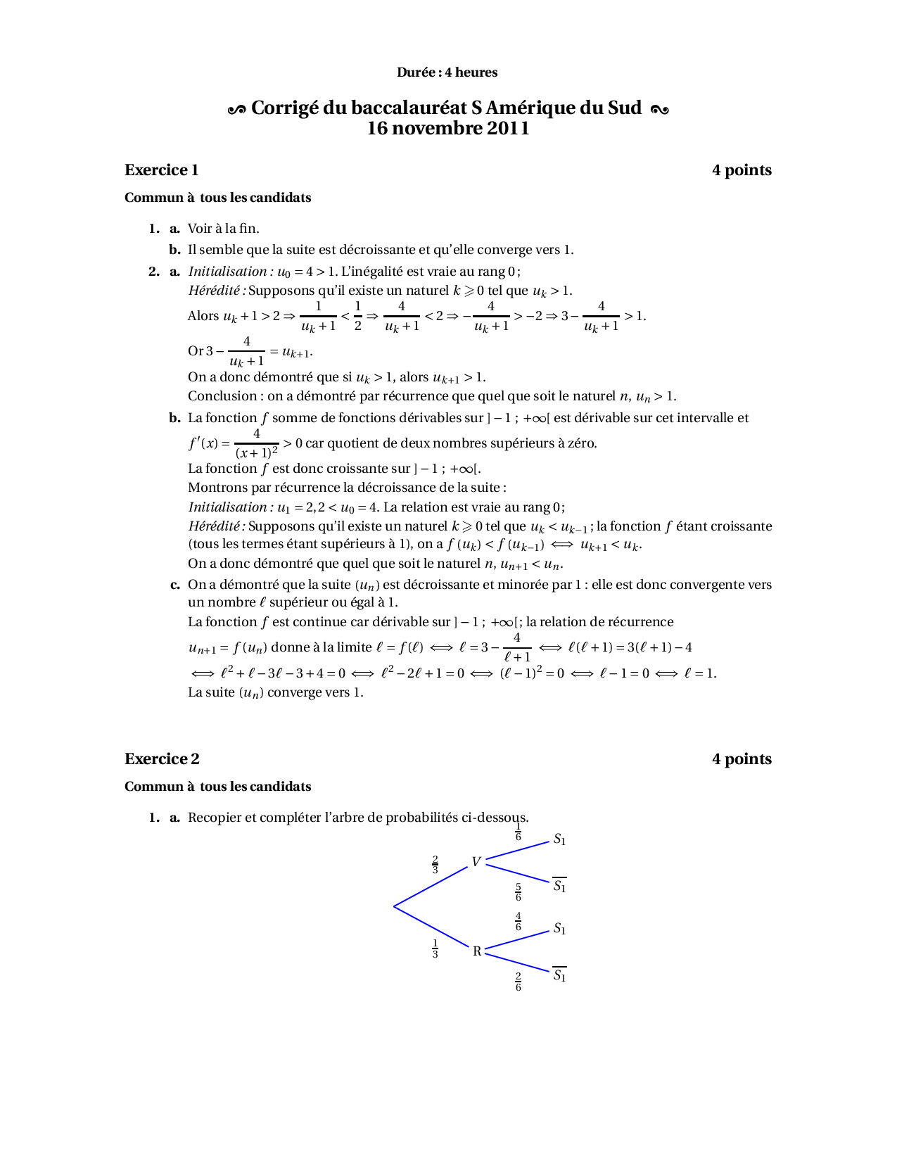 Annale Maths Bac S Amérique du Sud novembre 2011 - Corrigé
