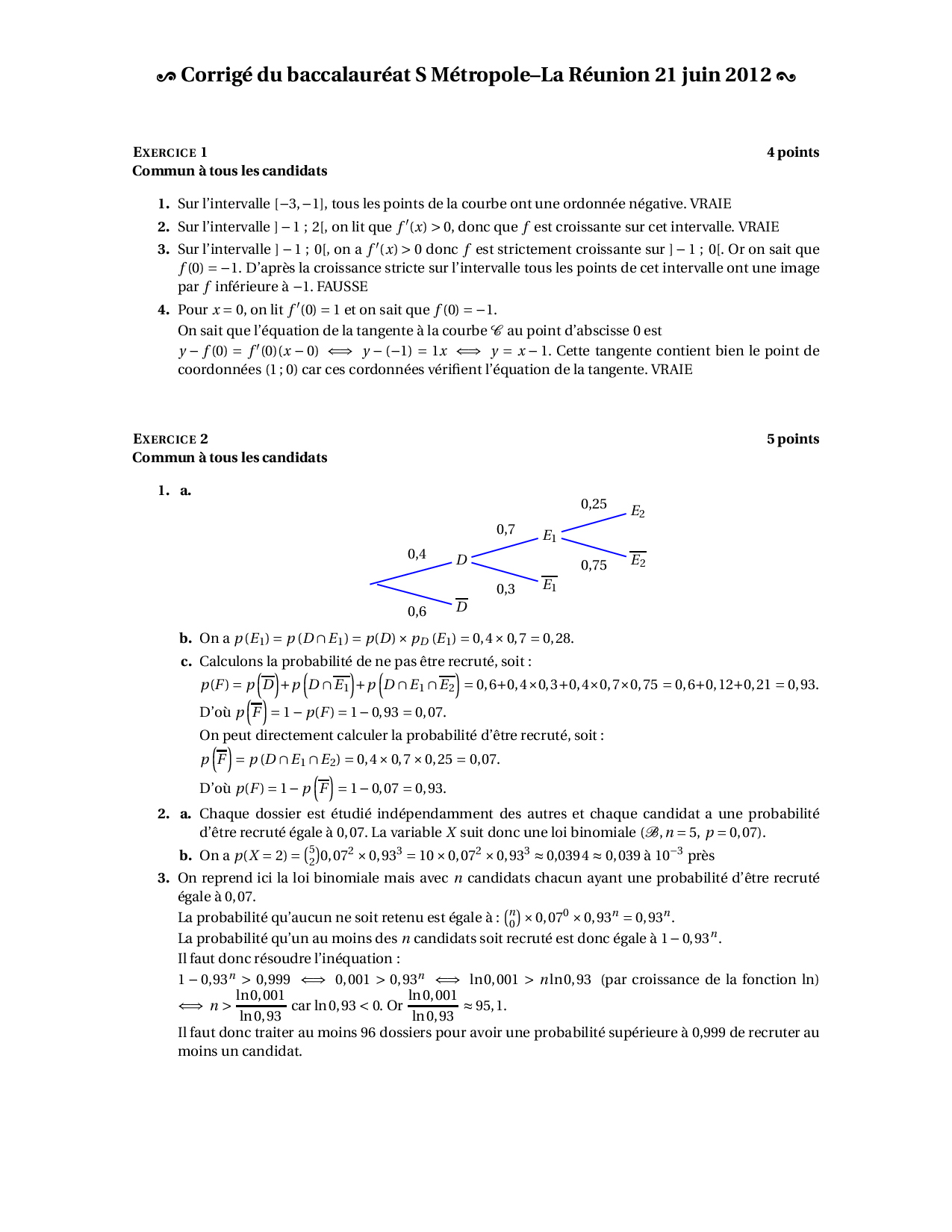Annale Maths Bac S Métropole juin 2012 - Corrigé