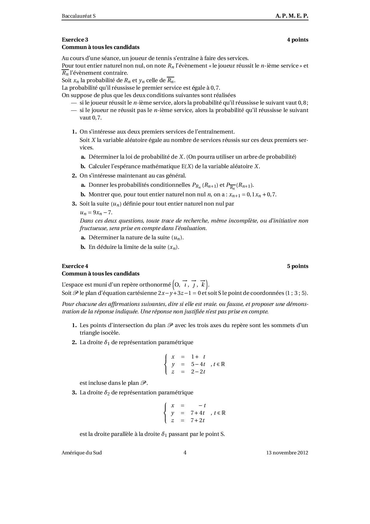 Annale Maths Bac S Amérique du Sud novembre 2012 - Sujet