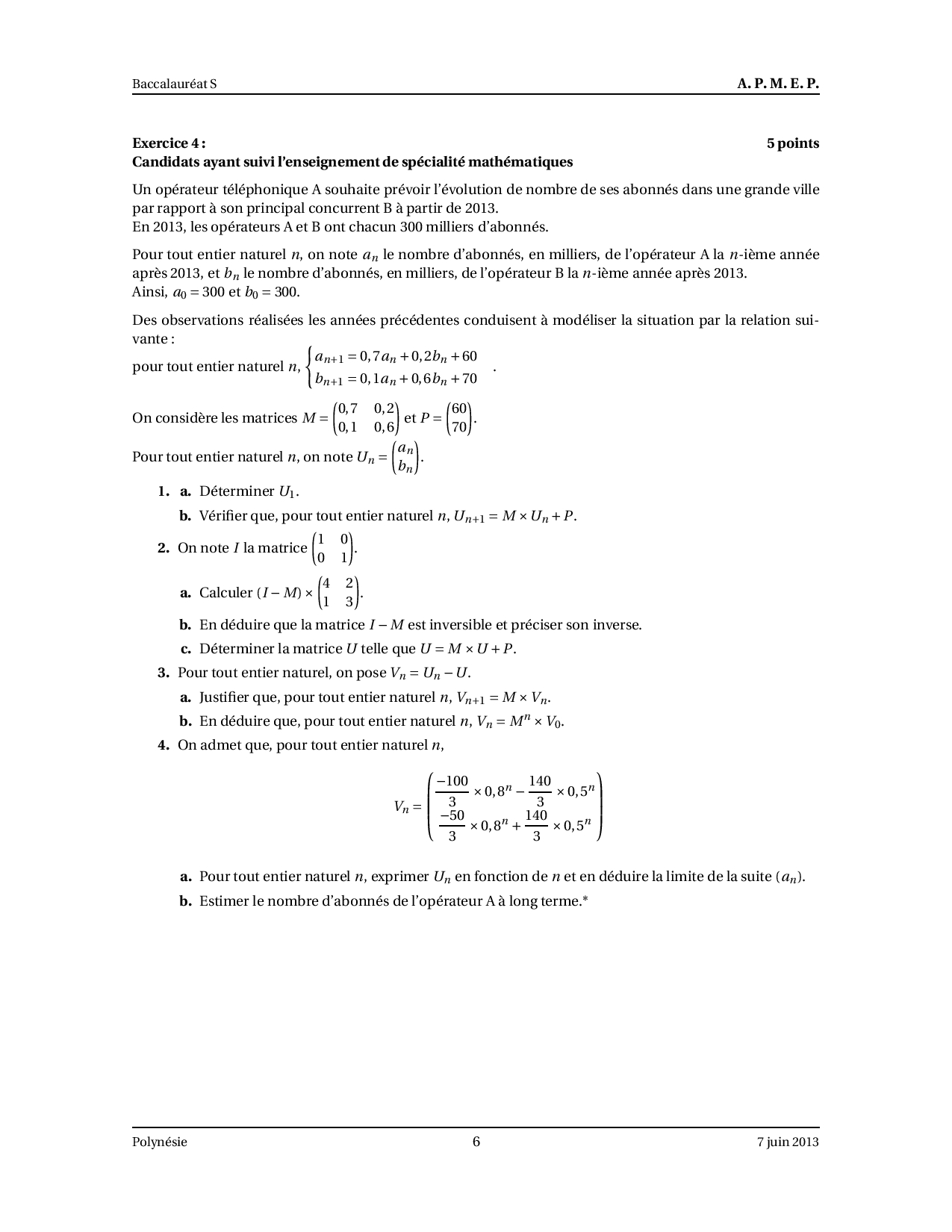 Annale Maths Bac S Polynésie juin 2013 - Sujet