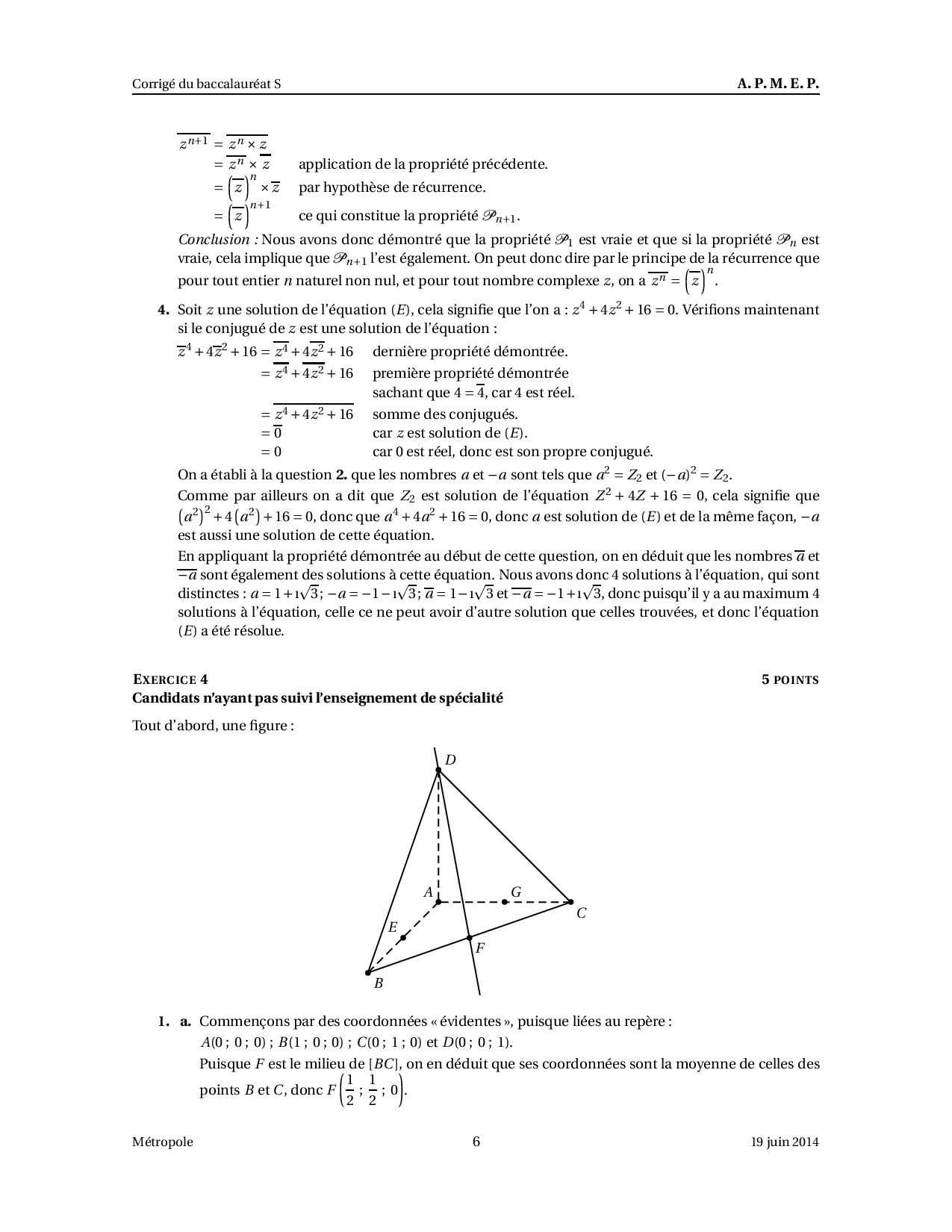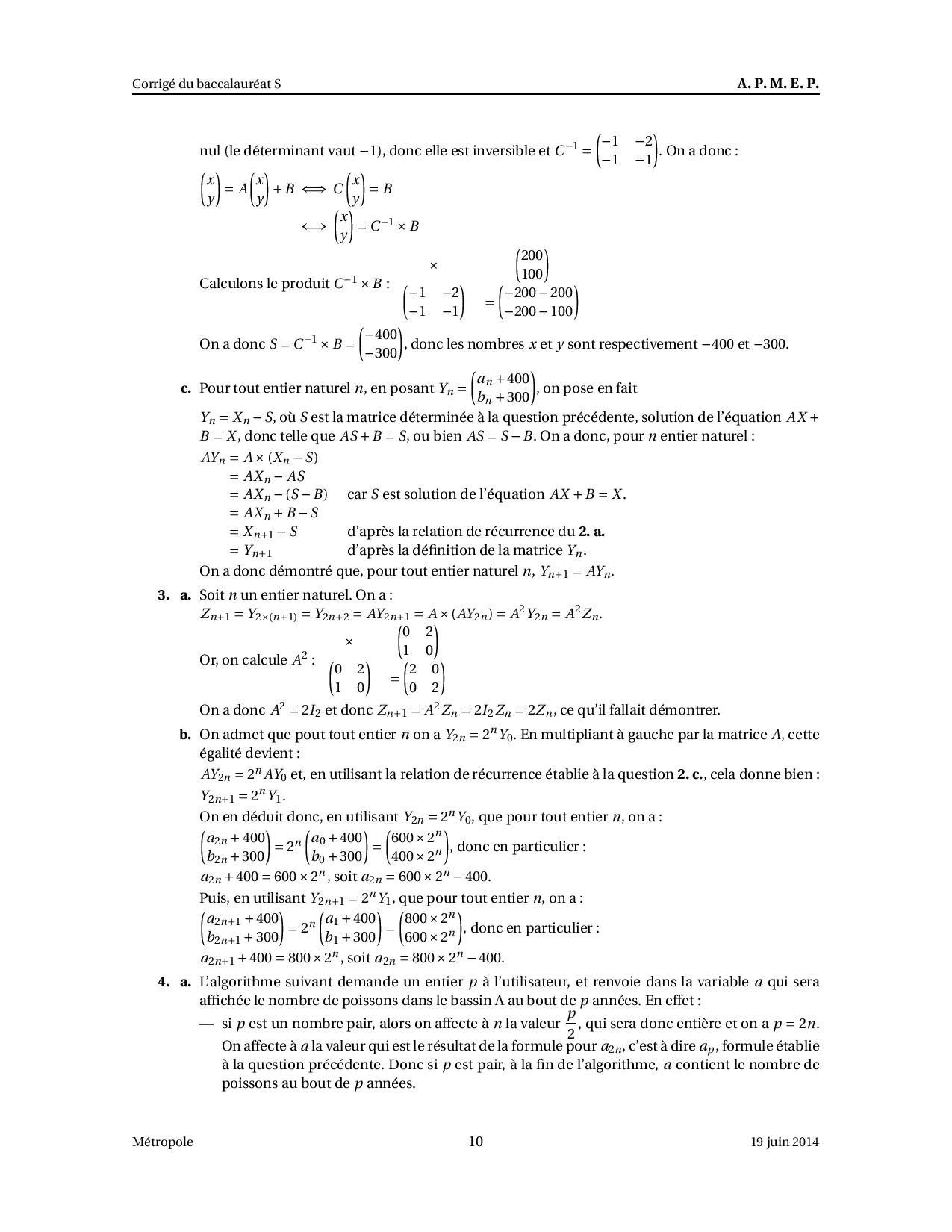 Annale Maths Bac S Métropole juin 2014 - Corrigé