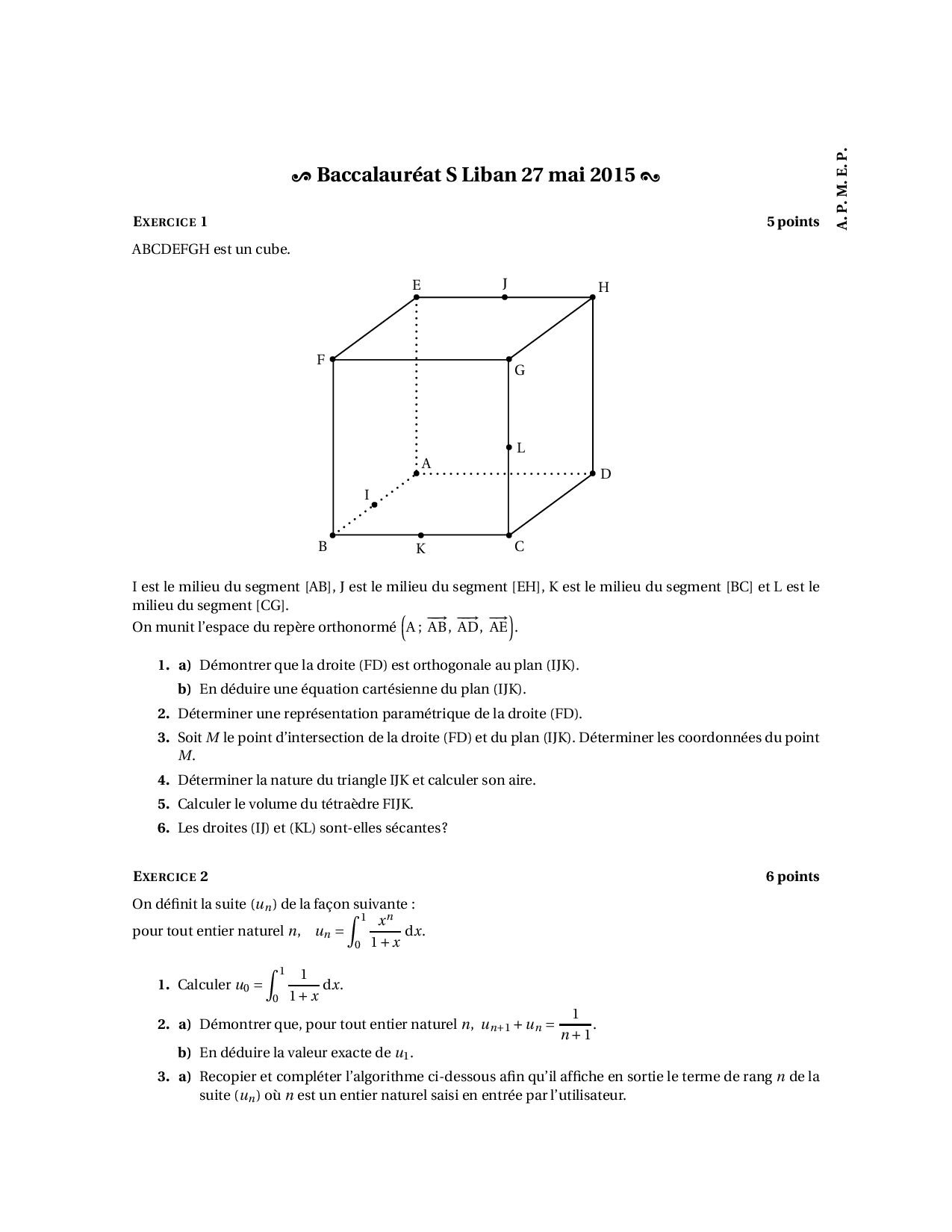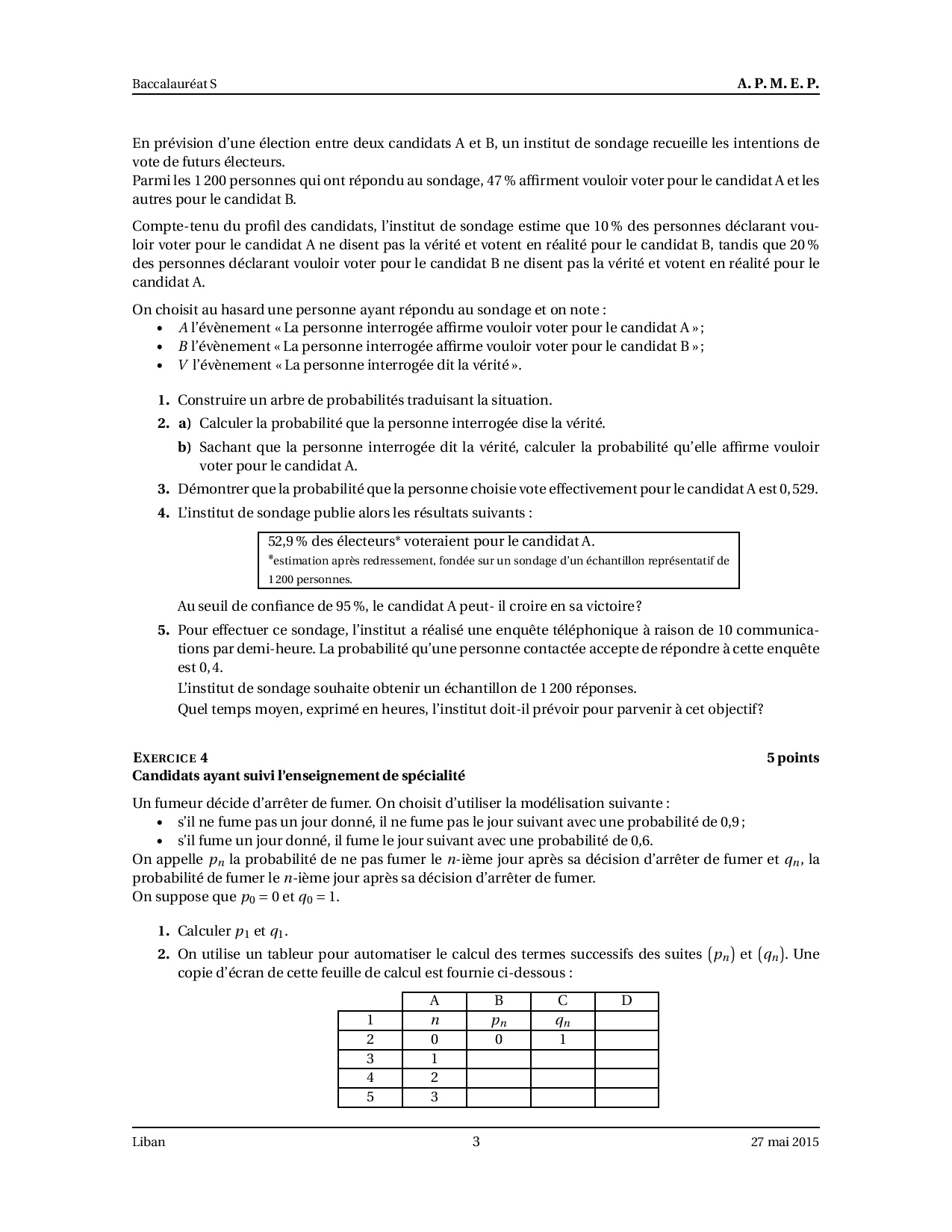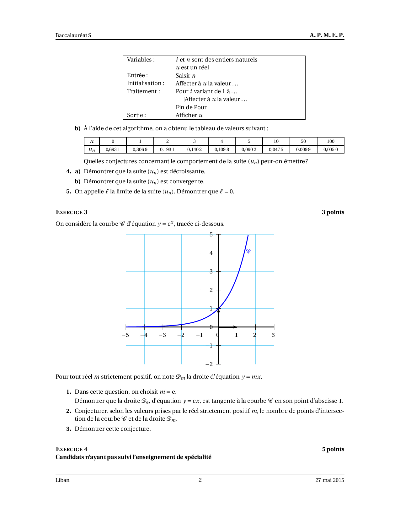 Annale Maths Bac S Liban mai 2015 - Sujet