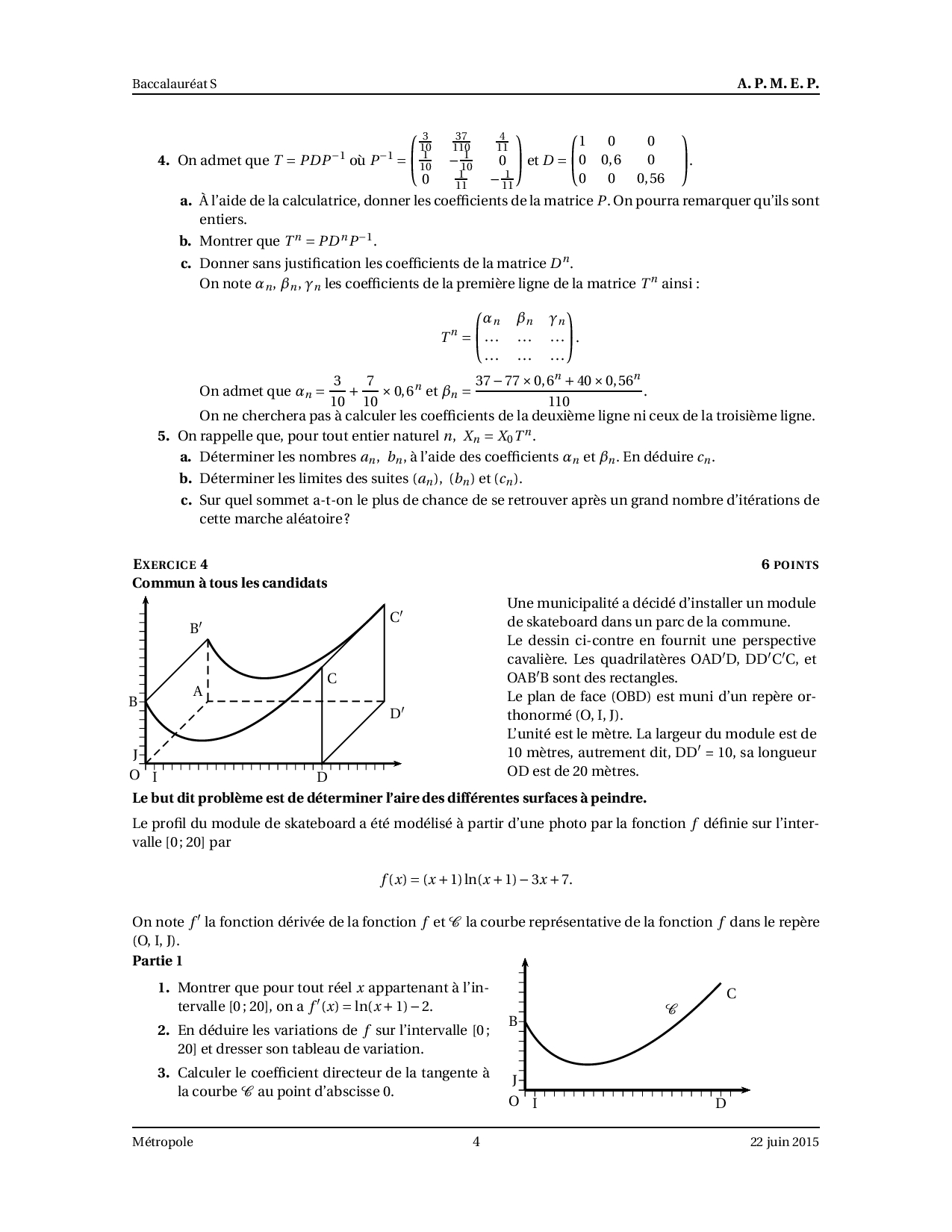 Annale Maths Bac S Métropole-La Réunion juin 2015 - Sujet