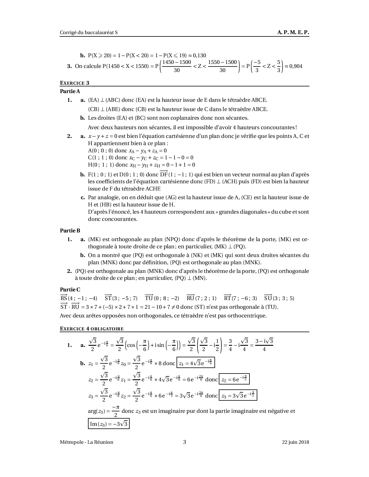 Annale Maths Bac S Métropole La réunion juin 2018 - Corrigé