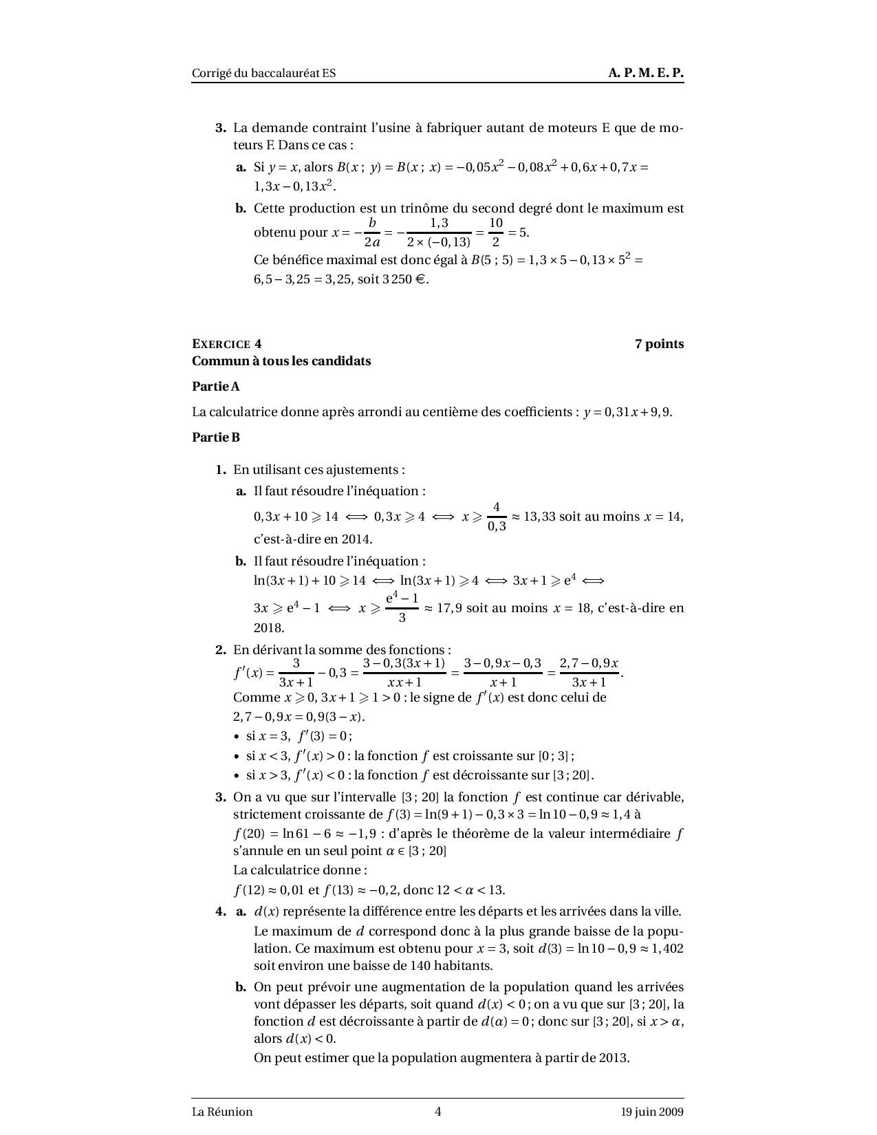 Annale Maths Bac ES La Réunion juin 2009 - Corrigé