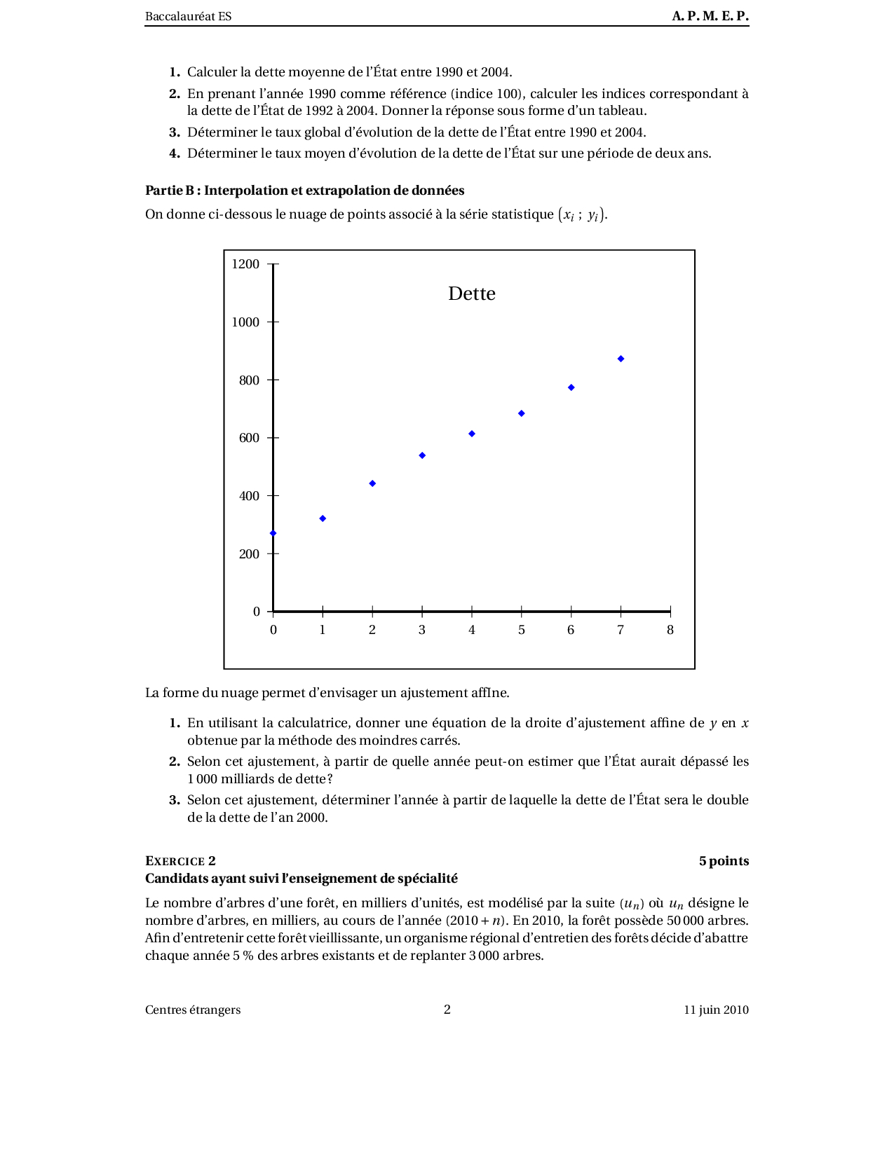 Annale Maths Bac ES Centres étrangers juin 2010 - Sujet