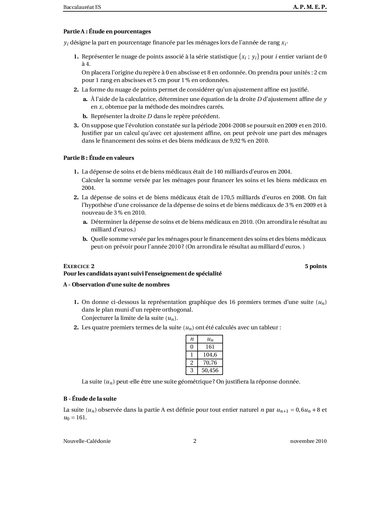 Annale Maths Bac ES Nouvelle calédonie novembre 2010 - Sujet