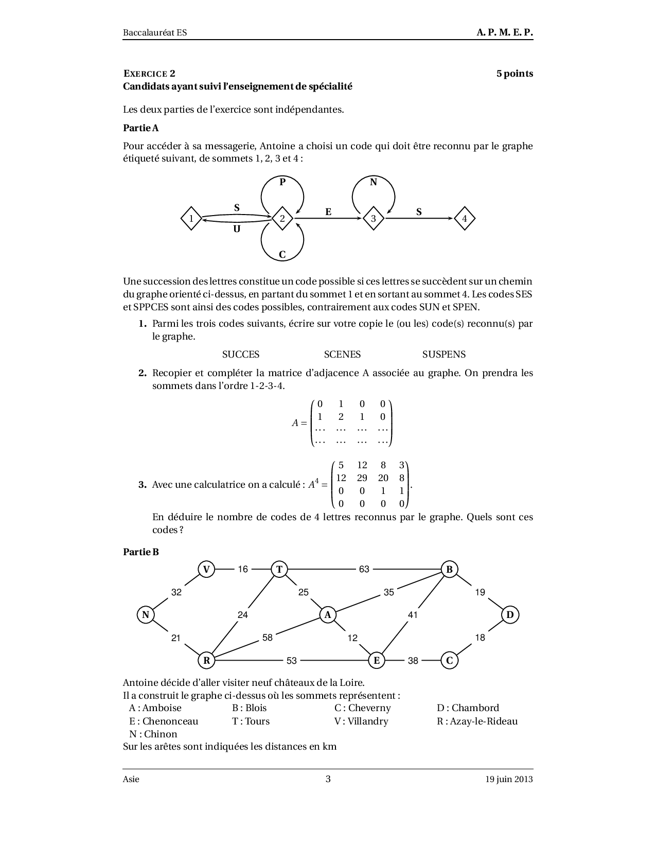 Annale Maths Bac ES-L Asie juin 2013 - Sujet