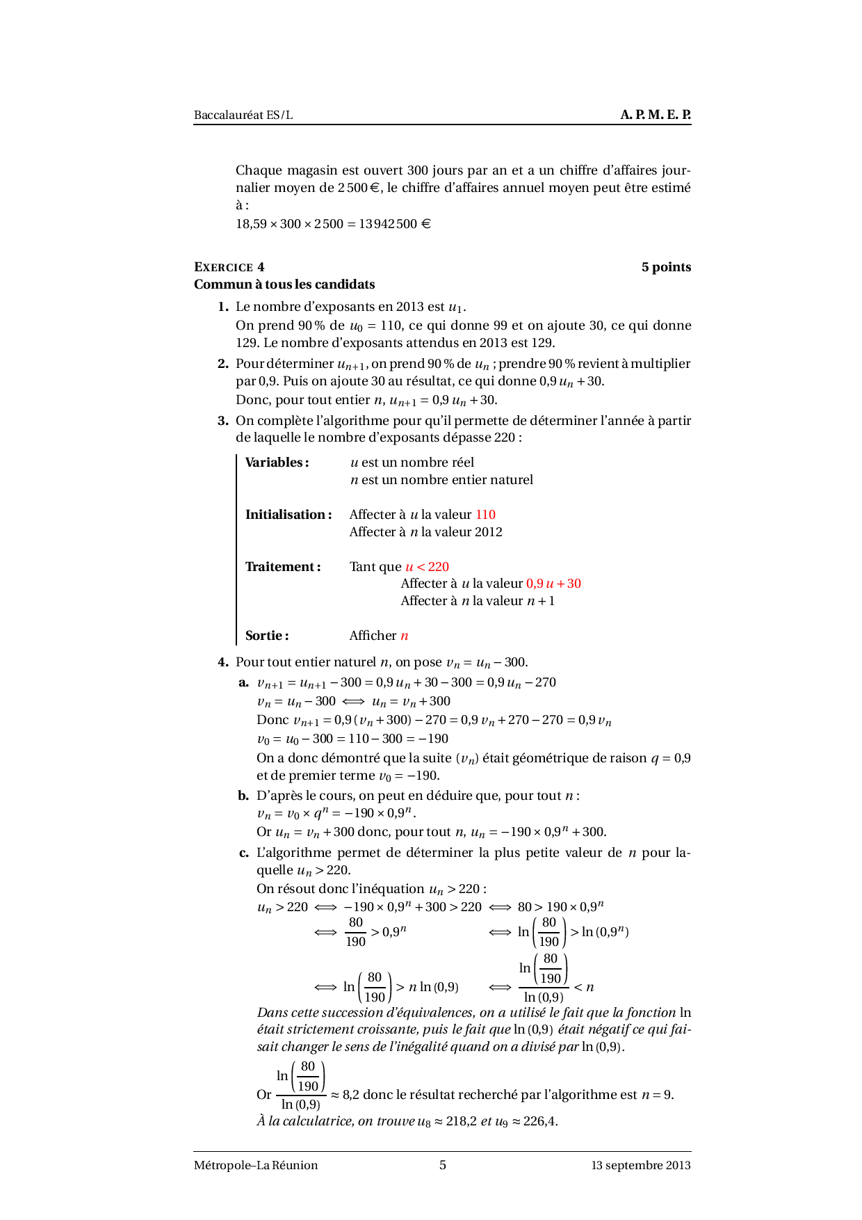 Annale Maths Bac ES-L Métropole septembre 2013 - Corrigé