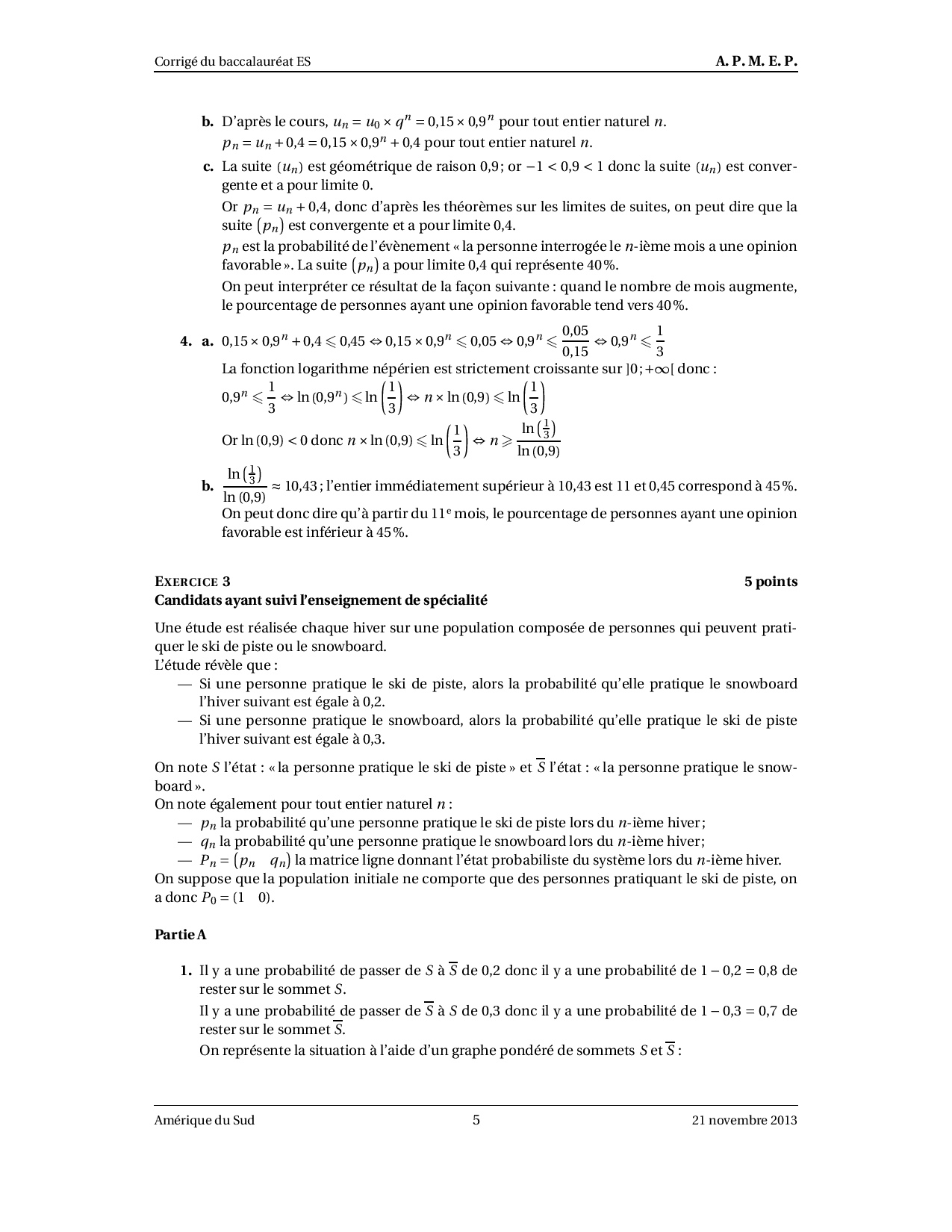 Annale Maths Bac ES-L Amérique du sud novembre 2013 - Corrigé