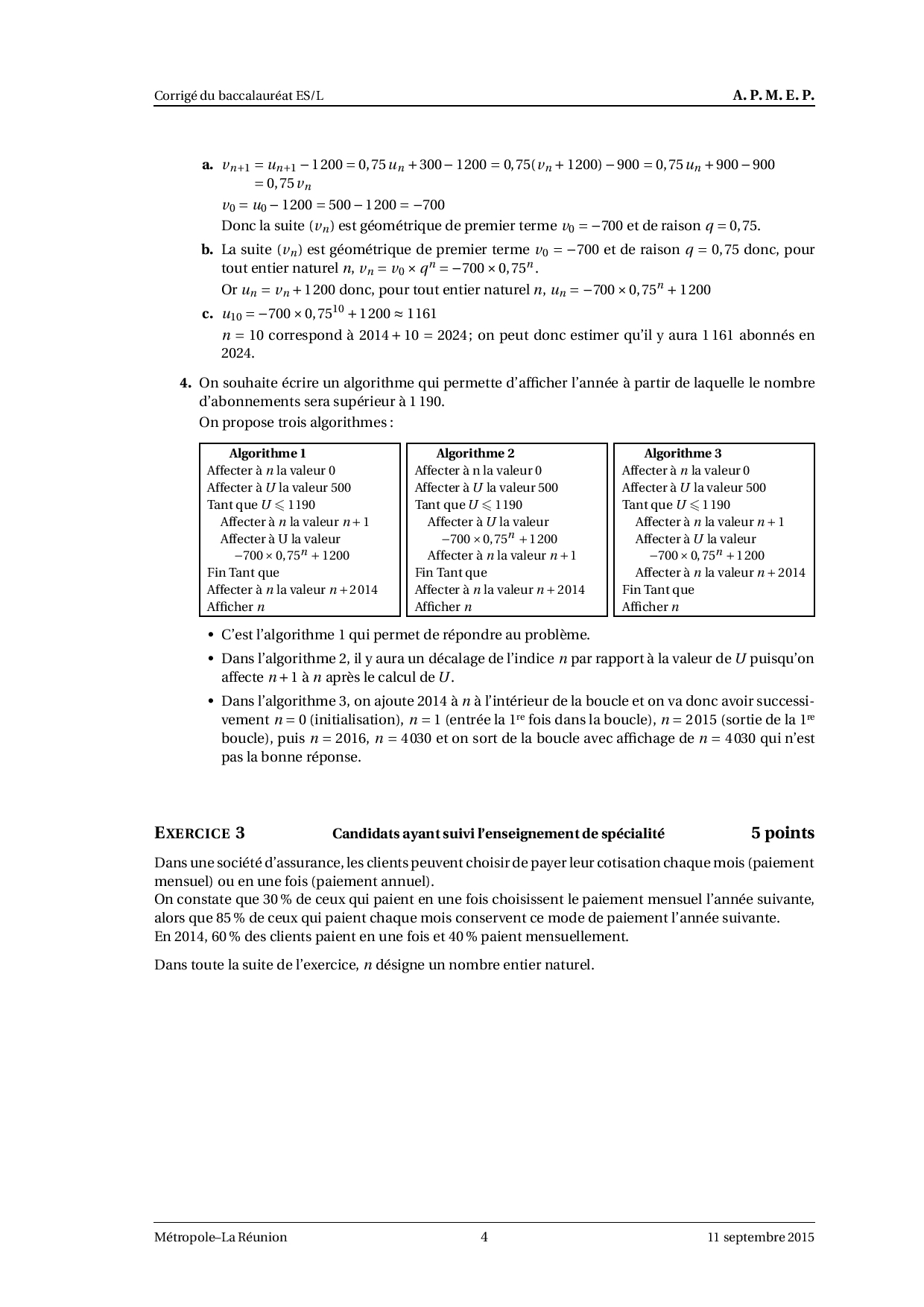 Annale Maths Bac ES-L Métropole septembre 2015 - Corrigé