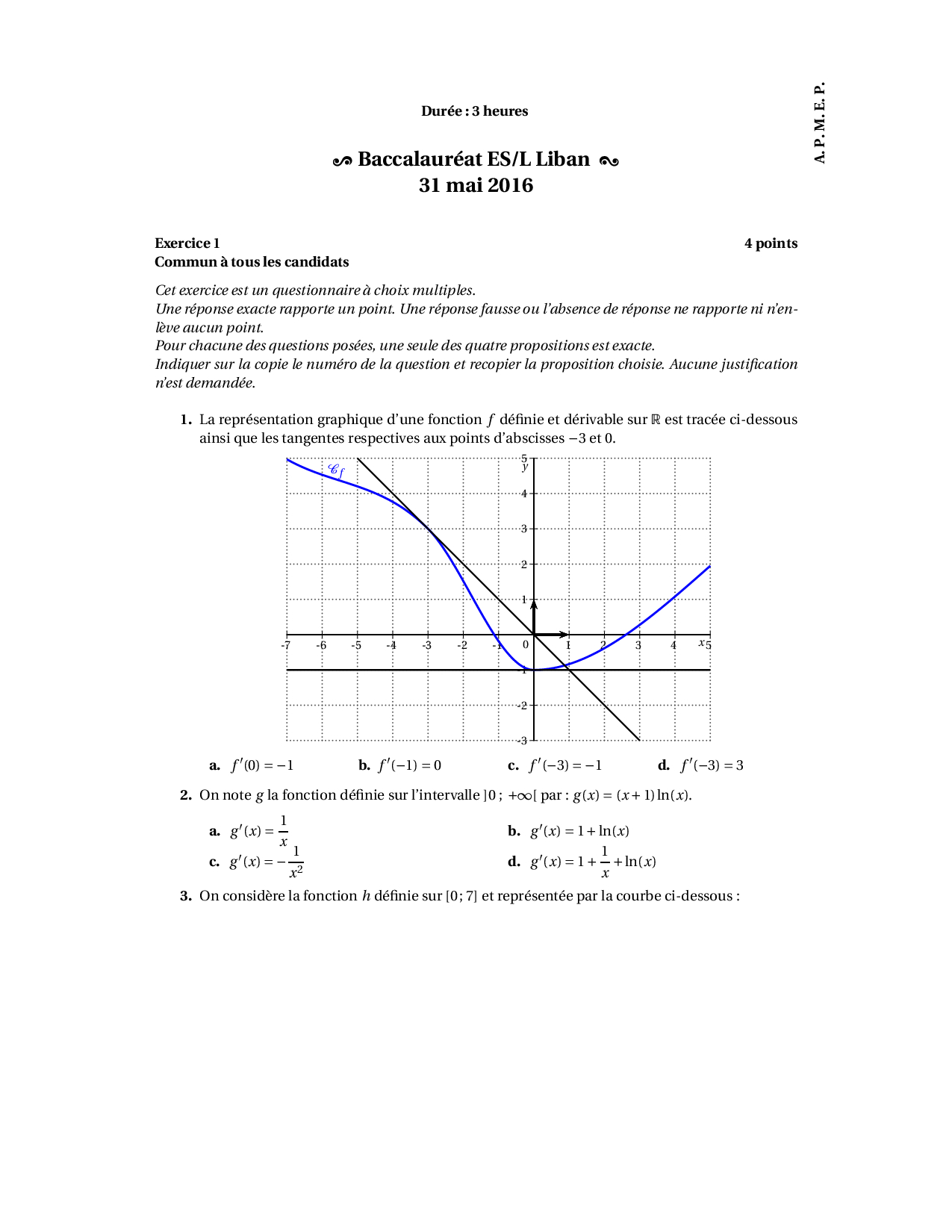 Annale Maths Bac ES-L Liban mai 2016 - Sujet