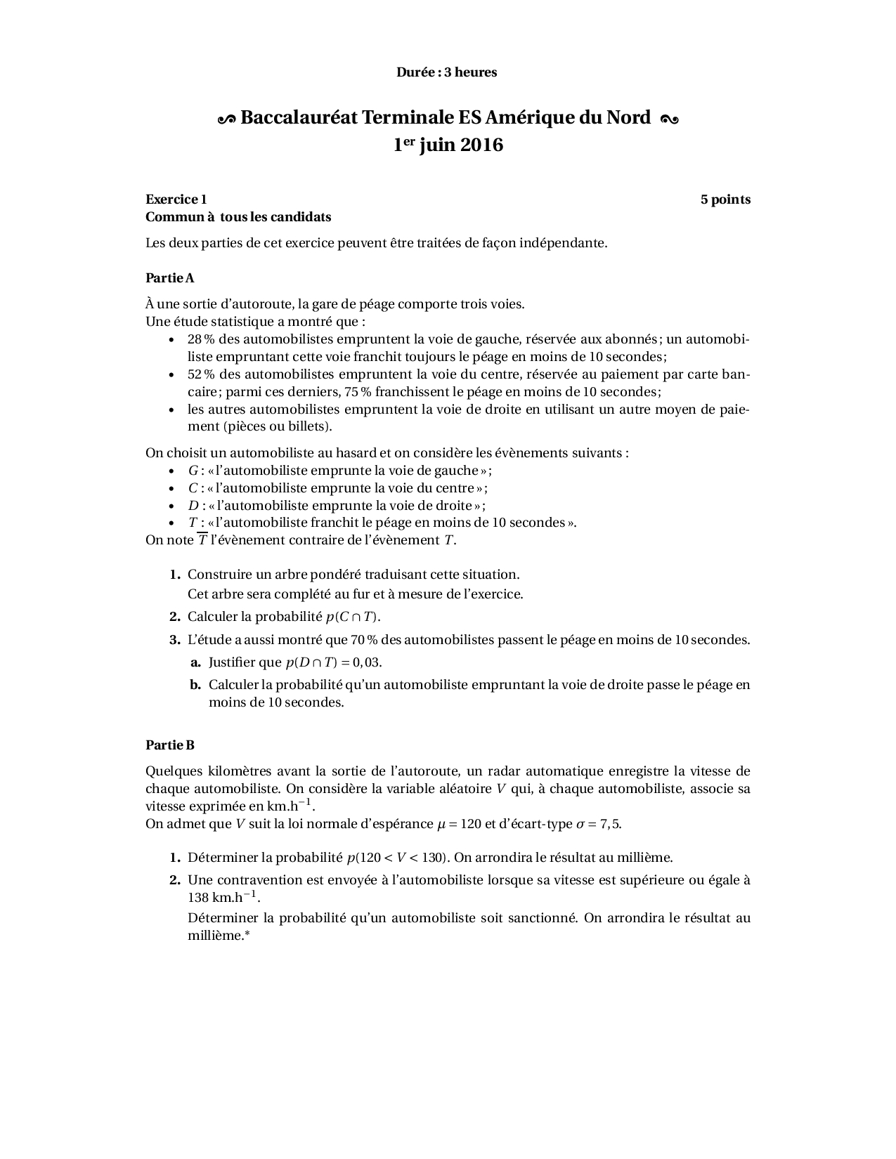 Annale Maths Bac ES-L Amérique du nord juin 2016 - Sujet