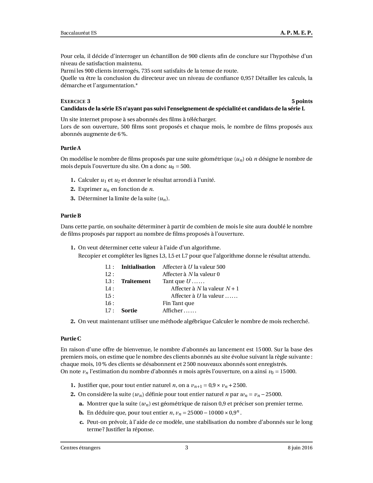 Annale Maths Bac ES-L Centres étrangers juin 2016 - Sujet