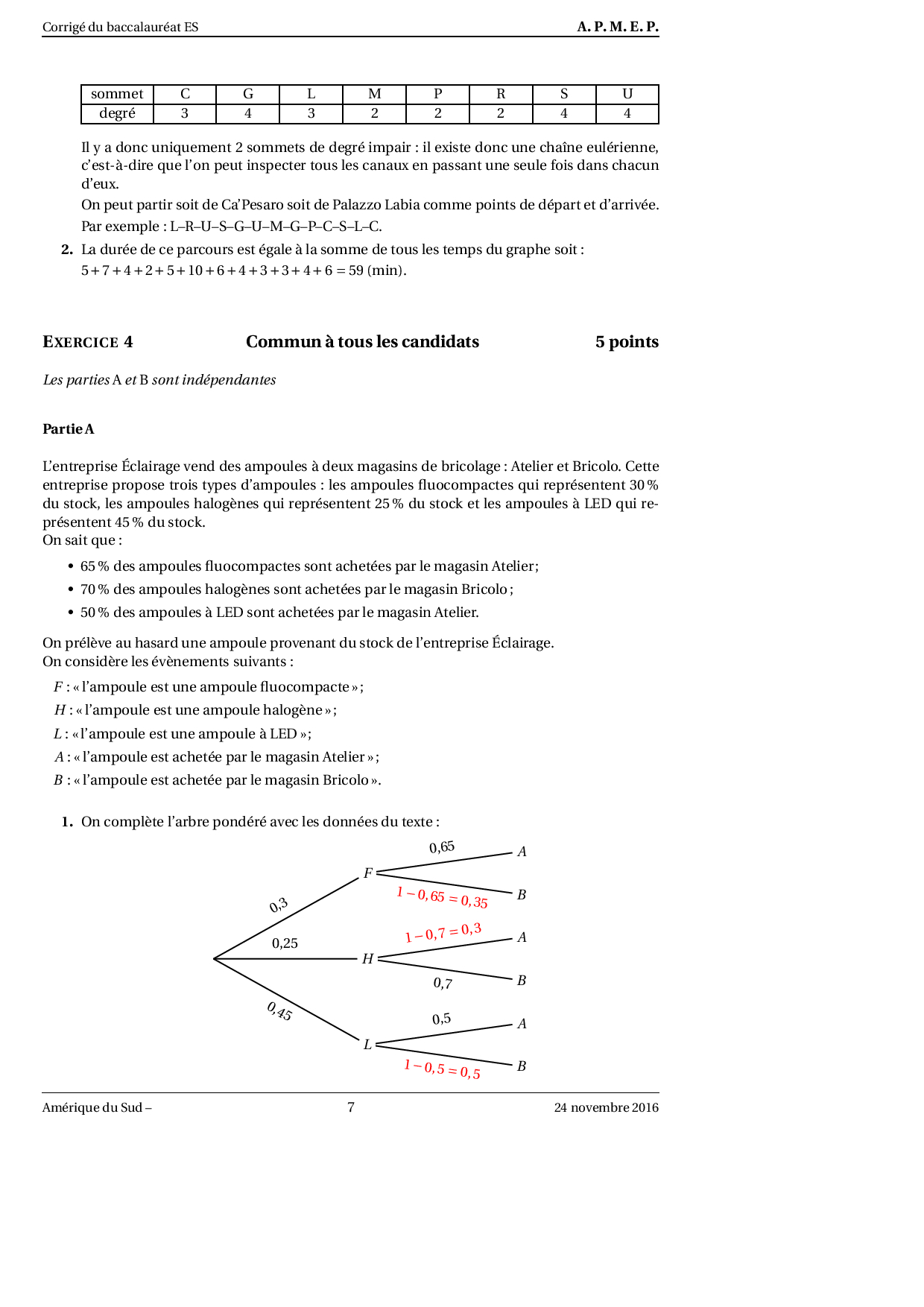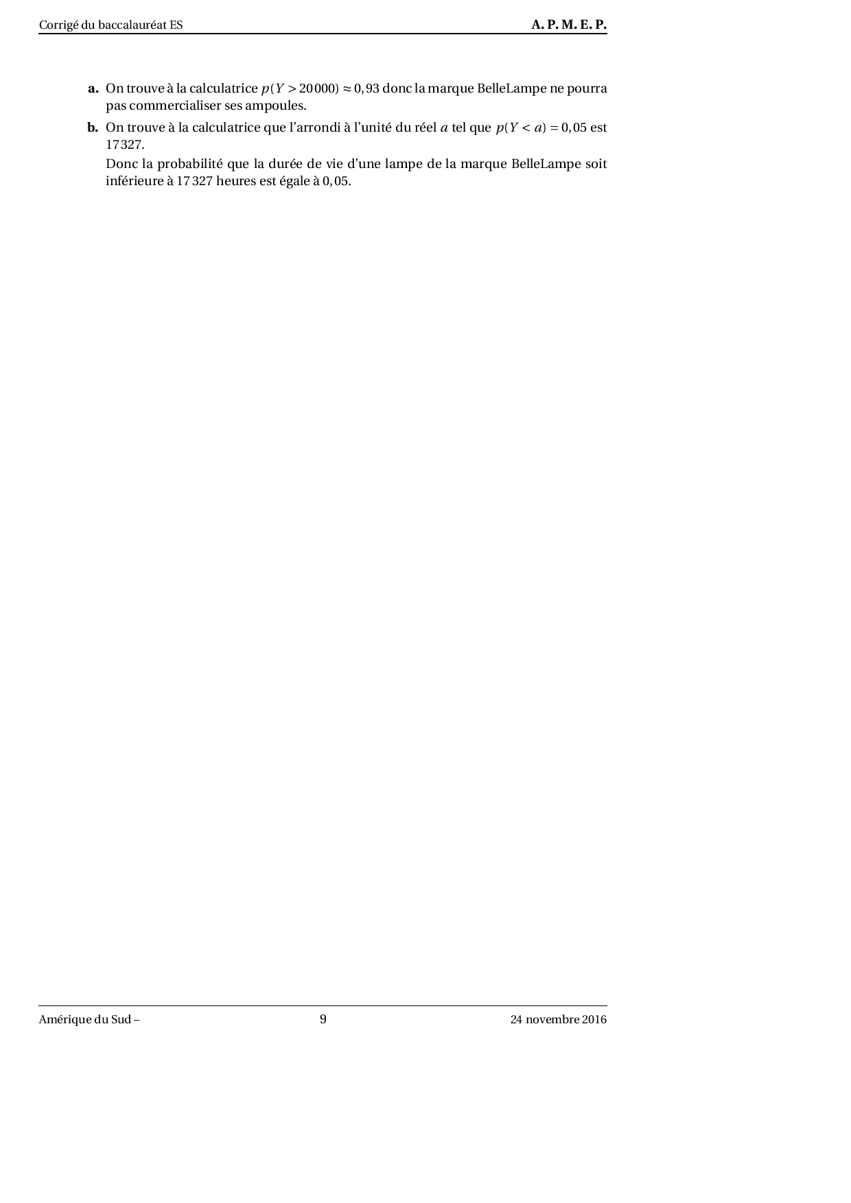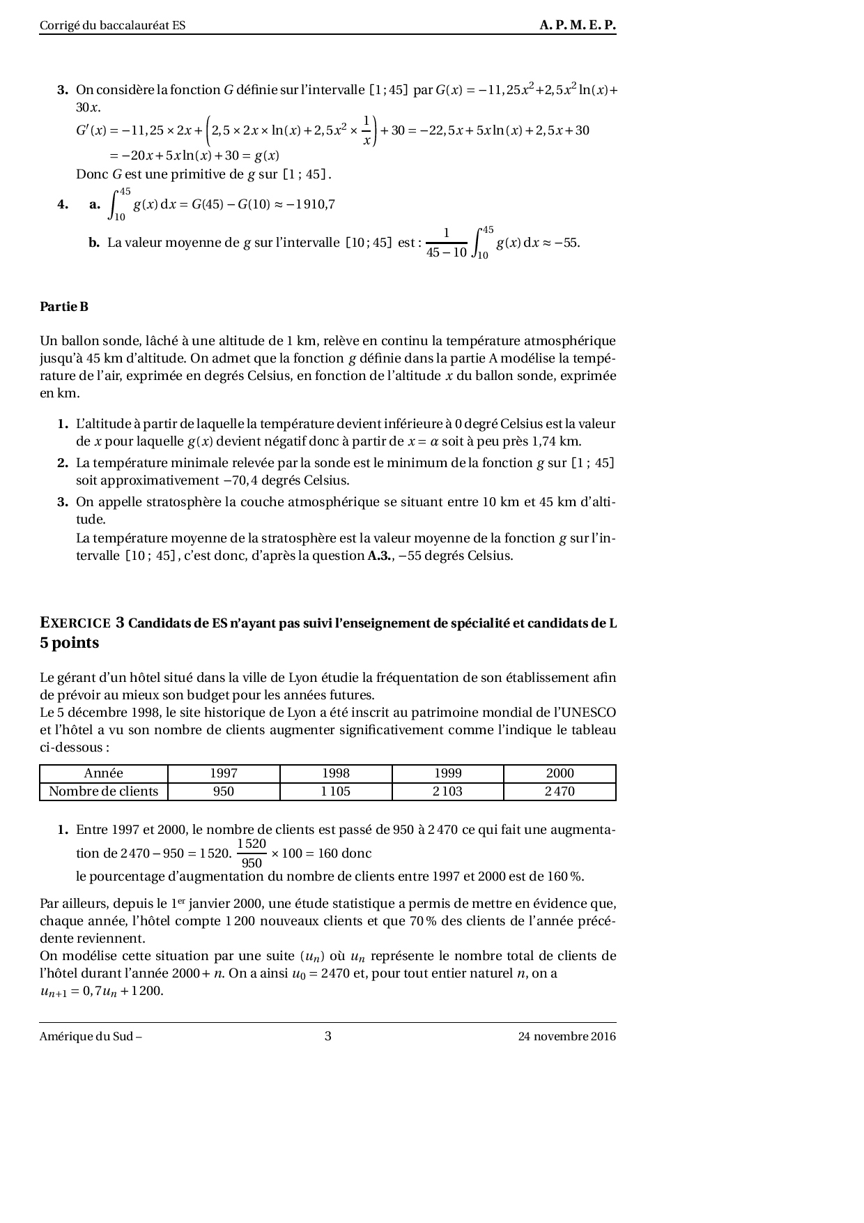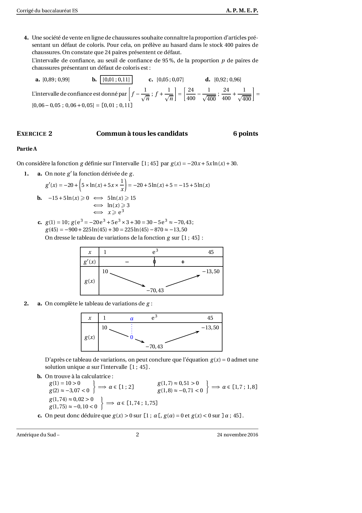 Annale Maths Bac ES-L Amérique du sud novembre 2016 - Corrigé