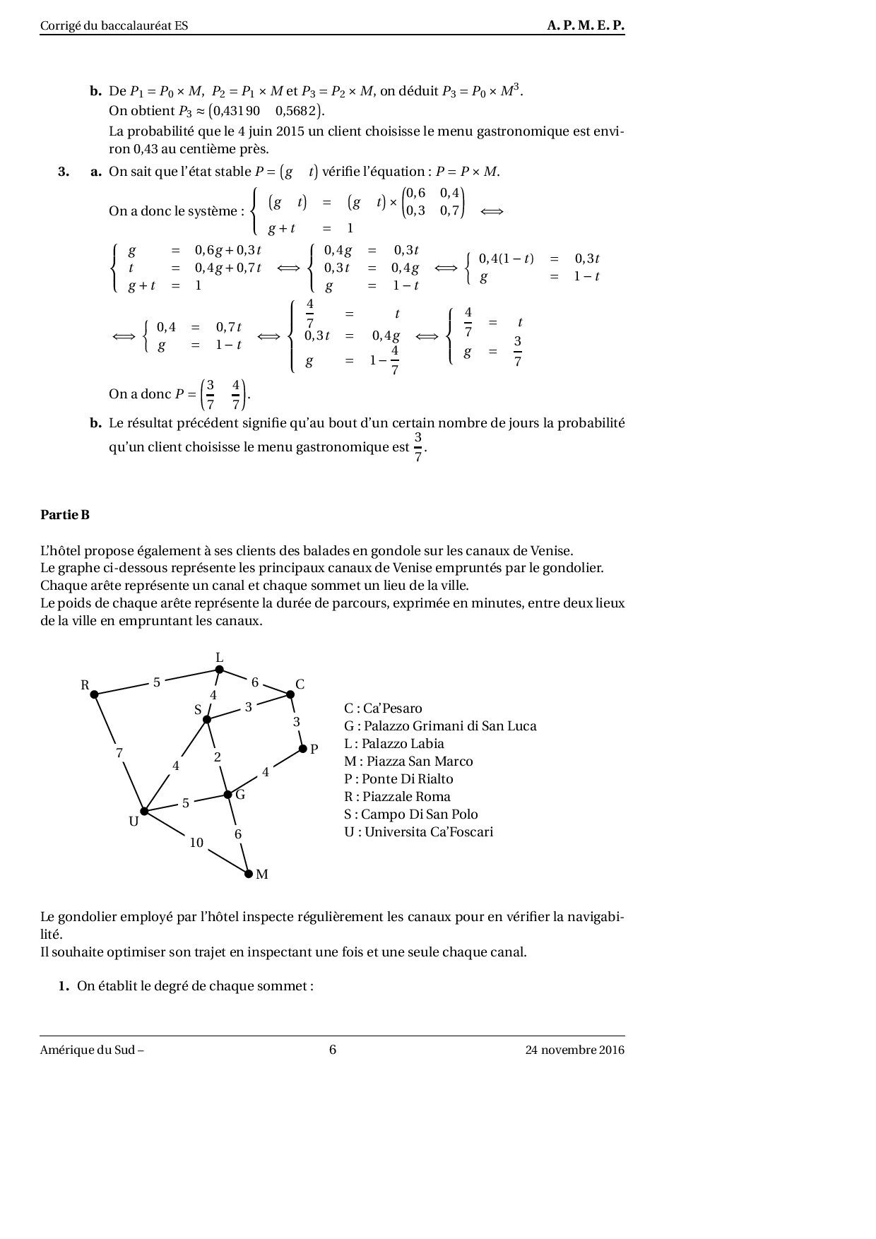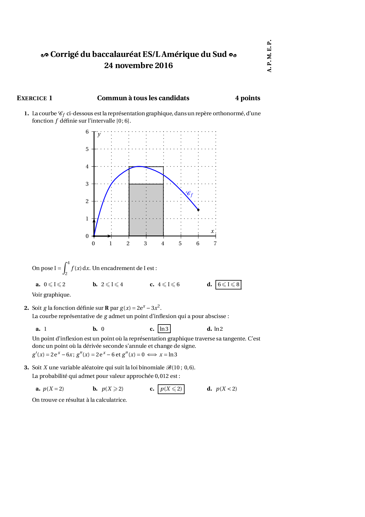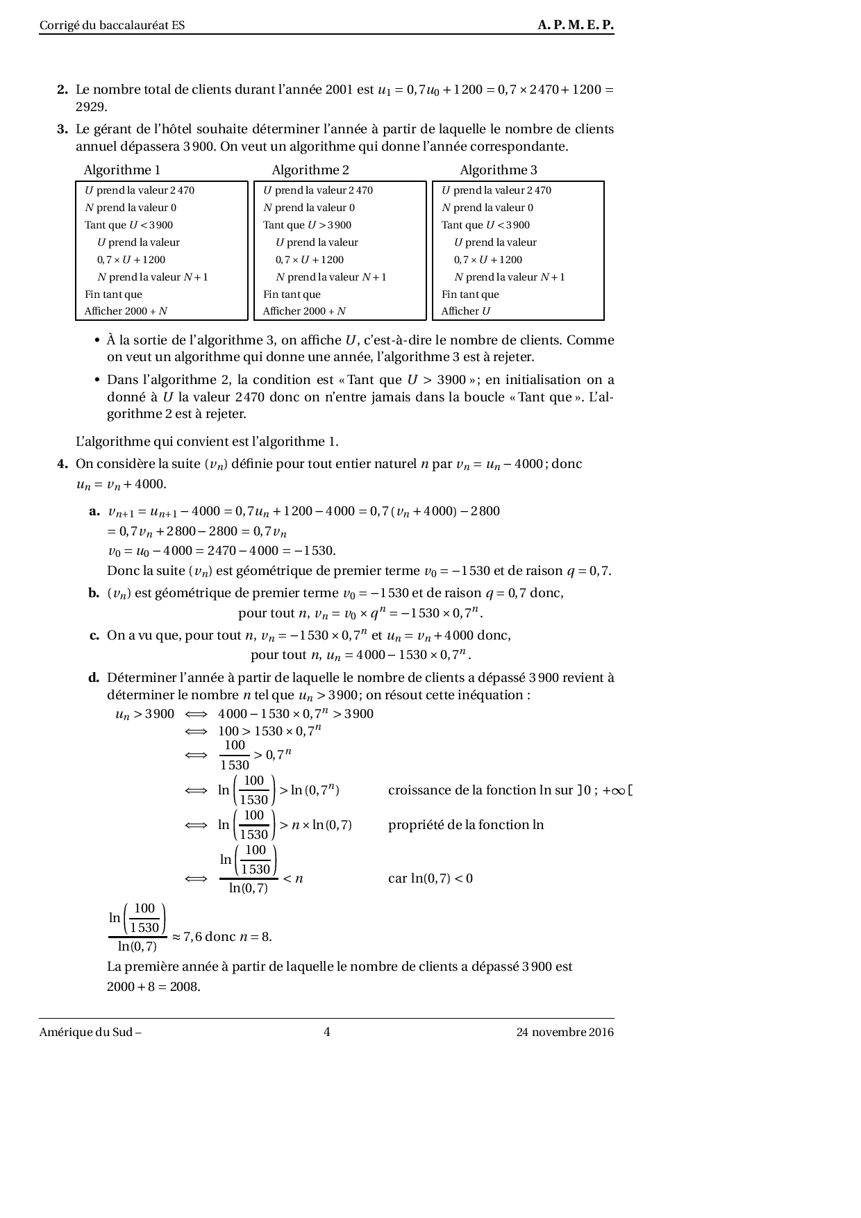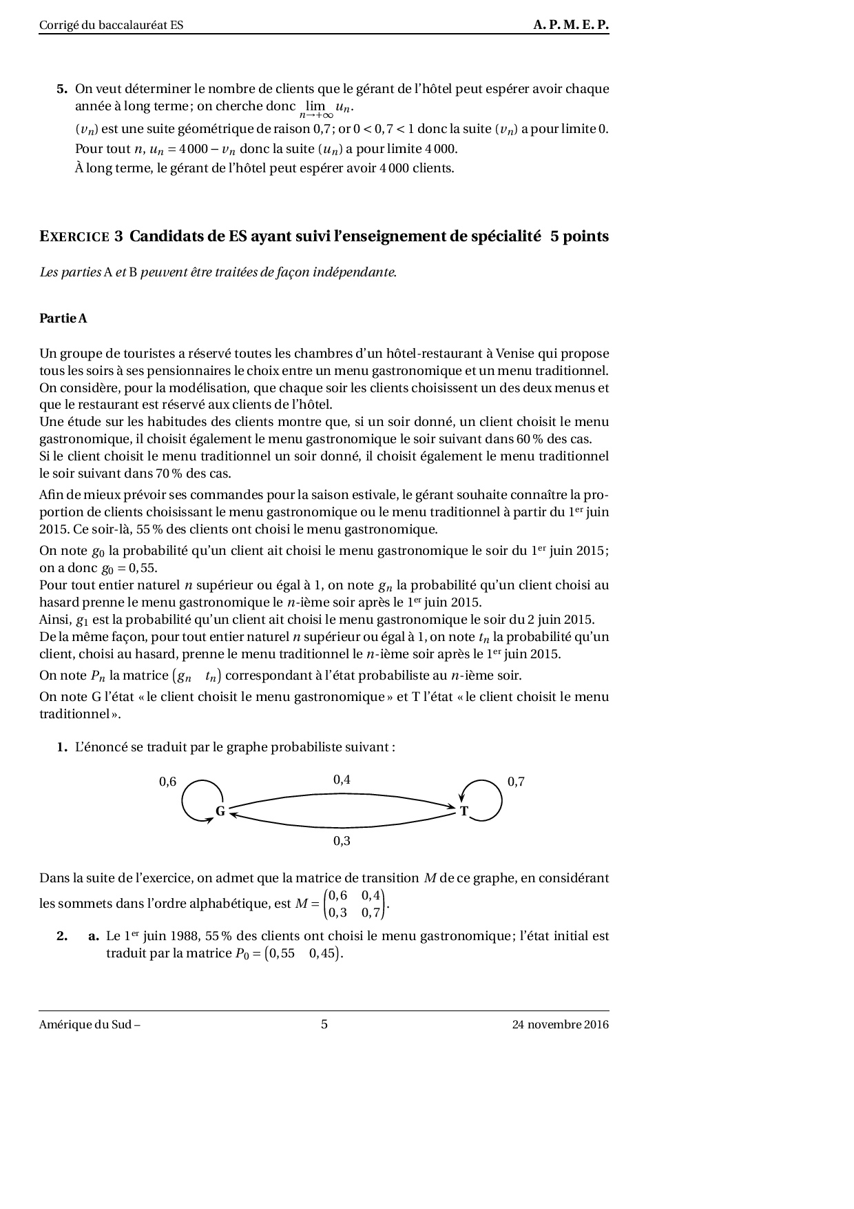 Annale Maths Bac ES-L Amérique du sud novembre 2016 - Corrigé