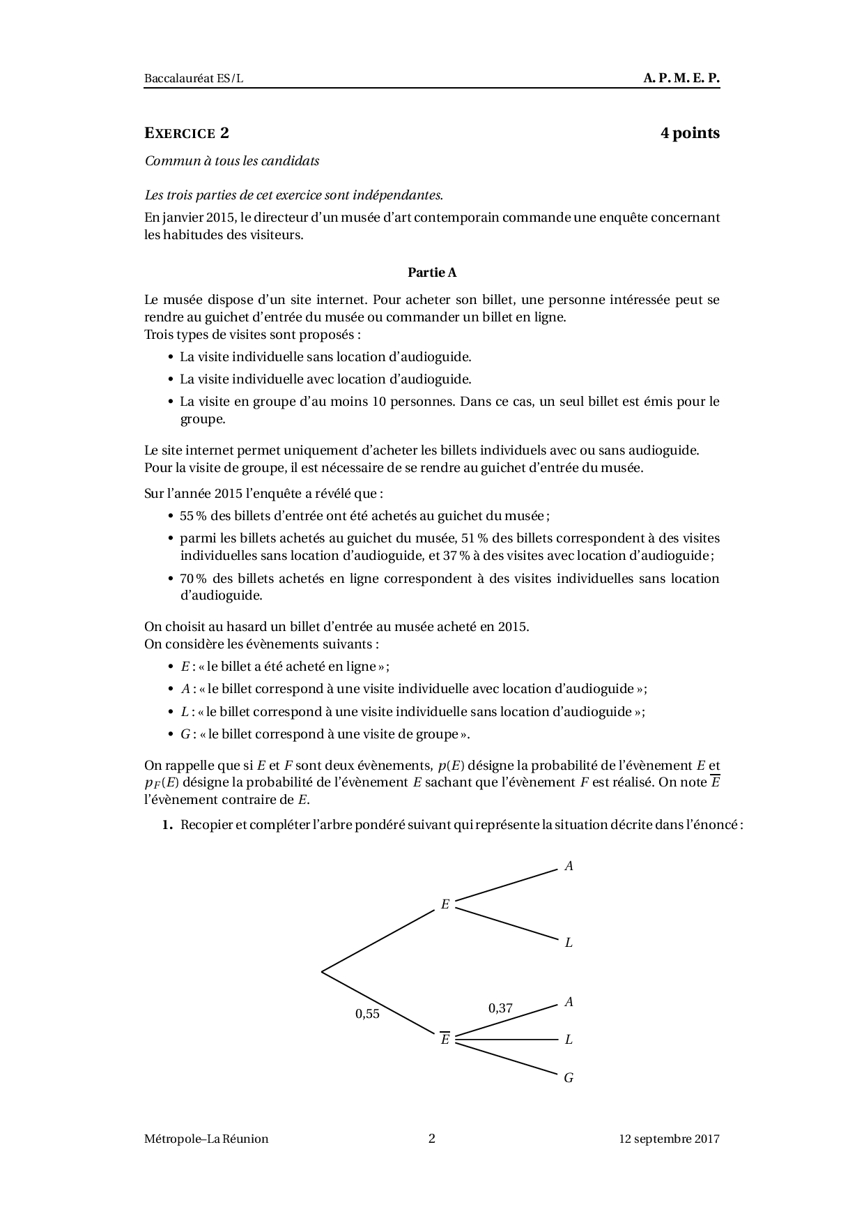Annale Maths Bac ES-L Métropole septembre 2017 - Sujet