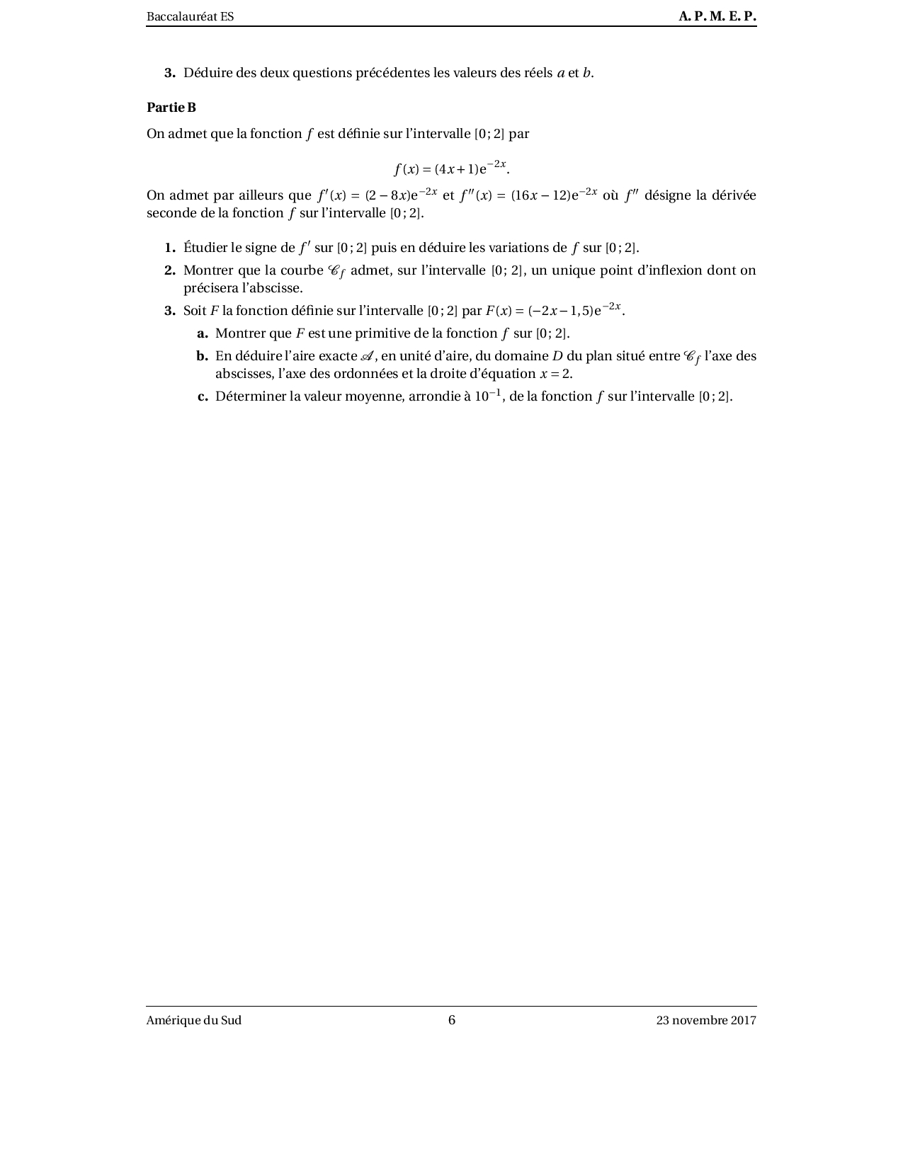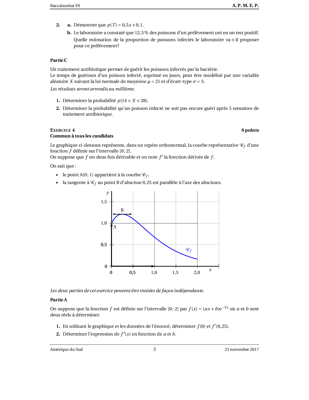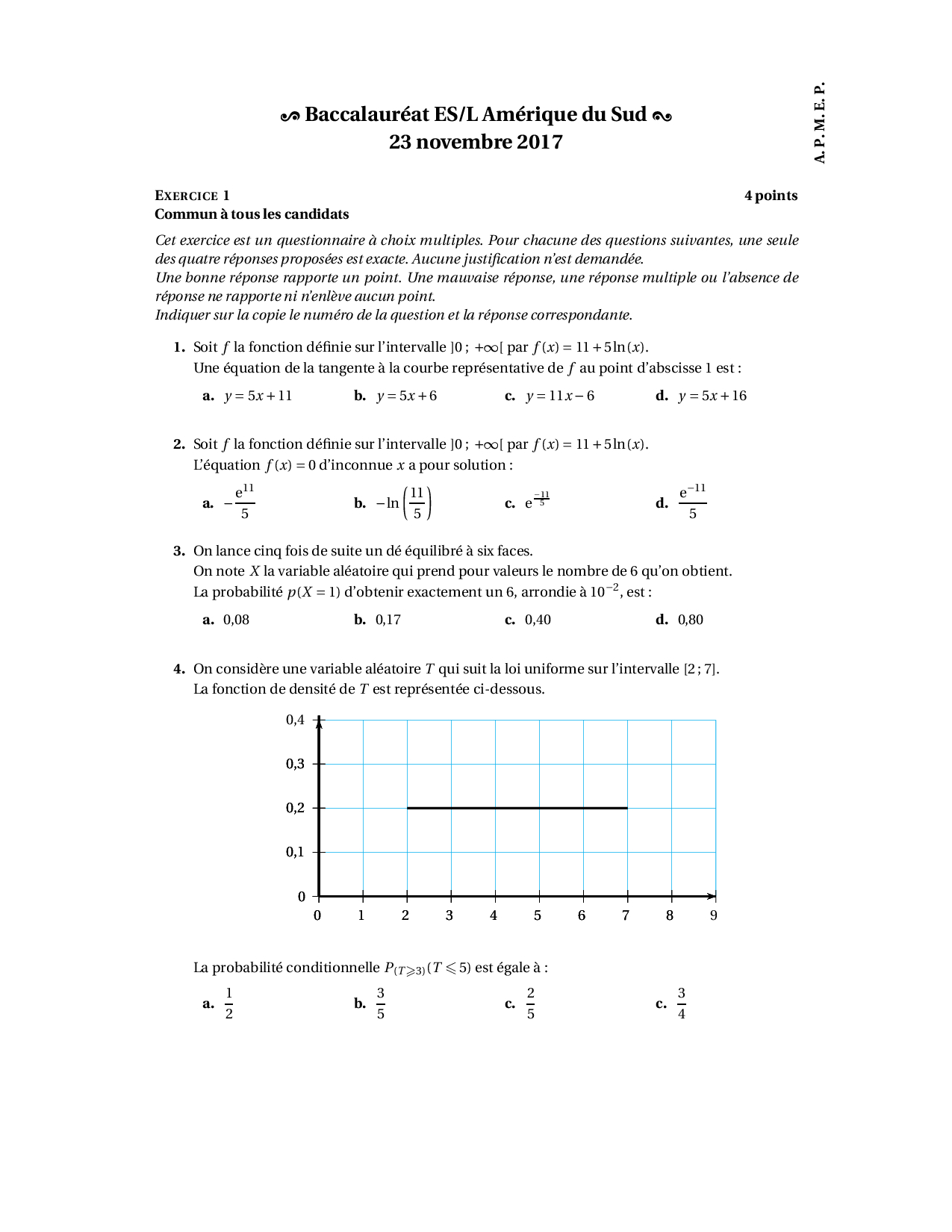 Annale Maths Bac ES-L Amérique du sud novembre 2017 - Sujet