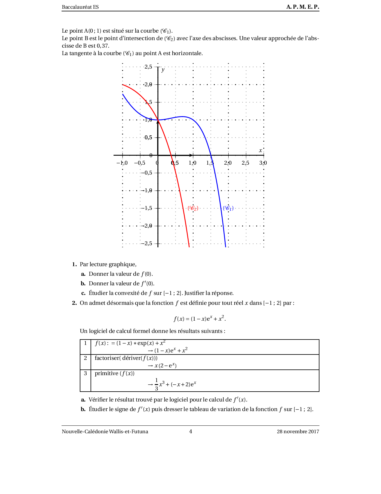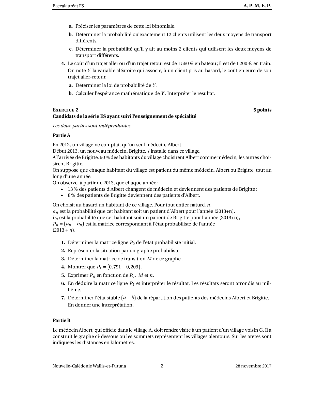 Annale Maths Bac ES-L Nouvelle calédonie novembre 2017 - Sujet