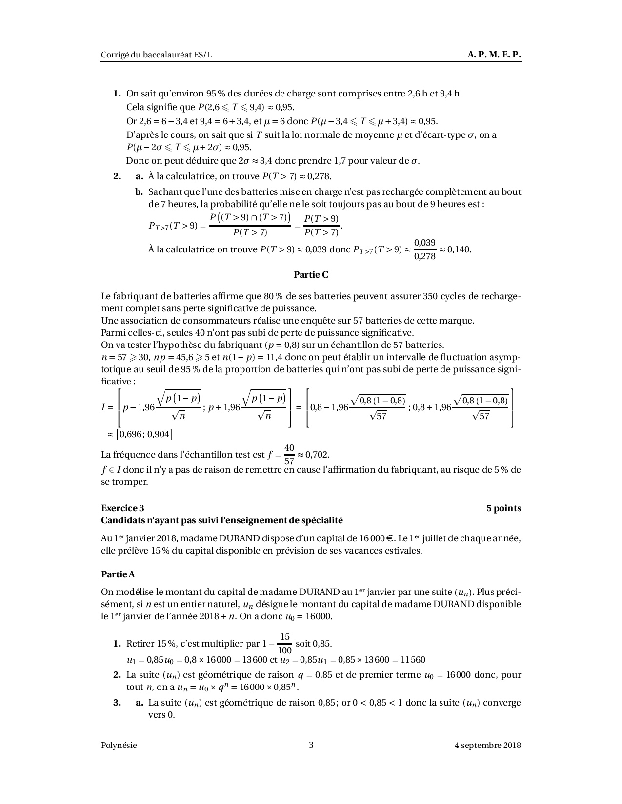Annale Maths Bac ES-L Polynésie septembre 2018 - Corrigé