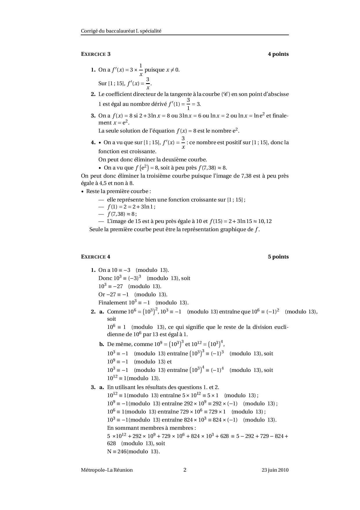 Annale Maths Bac L Métropole-La Réunion juin 2010 - Corrigé