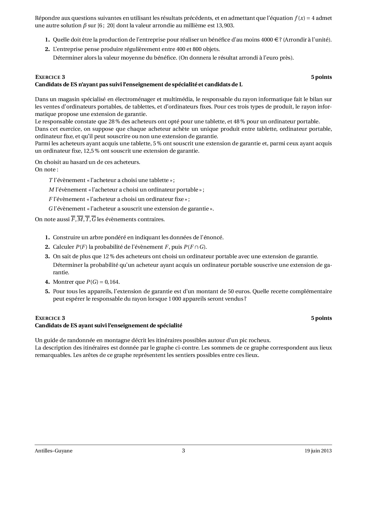 Annale Maths Bac ES-L Antilles-Guyane juin 2013 - Sujet