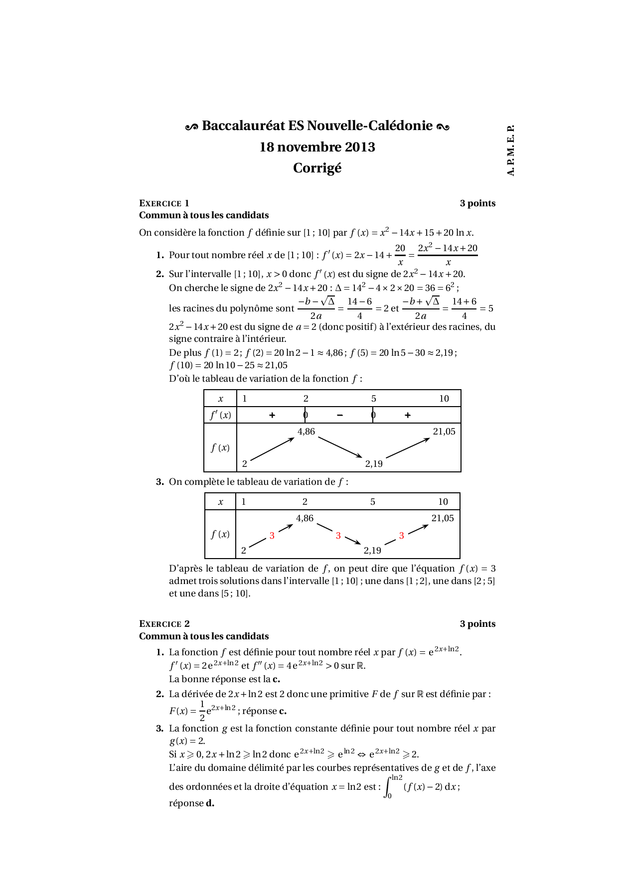 Annale Maths Bac ES-L Nouvelle calédonie novembre 2013 - Corrigé
