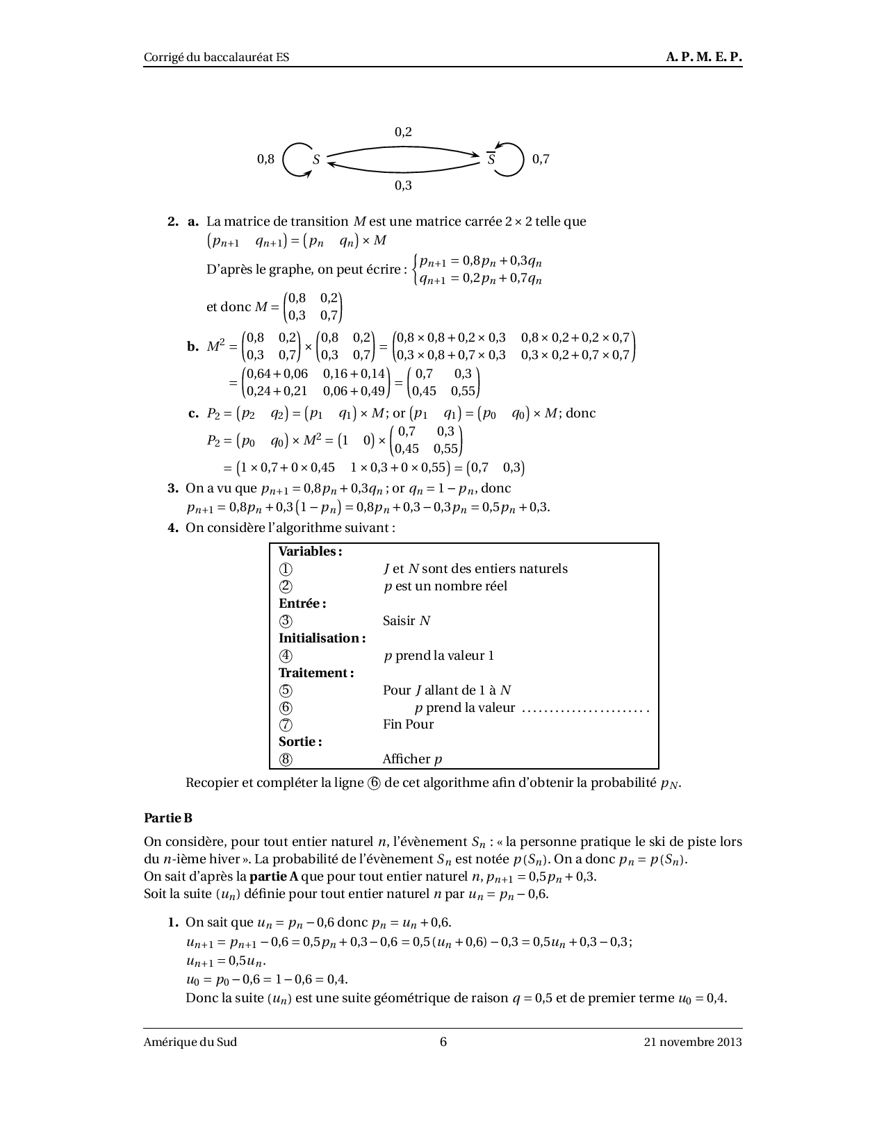 Annale Maths Bac ES-L Amérique du sud novembre 2013 - Corrigé