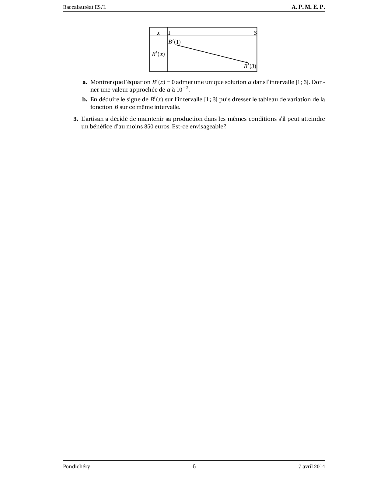 Annale Maths Bac ES-L Pondichéry avril 2014 - Sujet