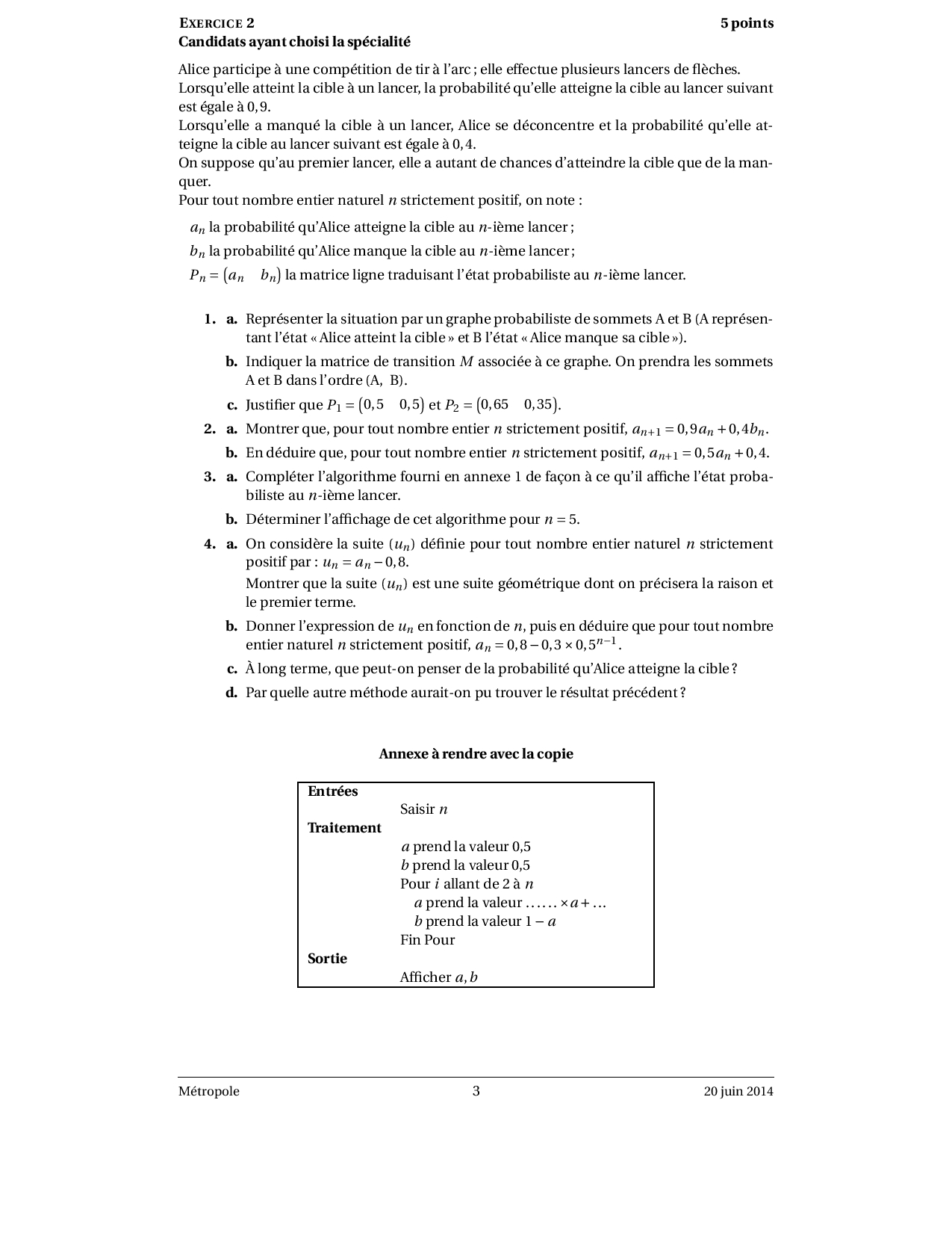 Annale Maths Bac ES-L Métropole juin 2014 - Sujet