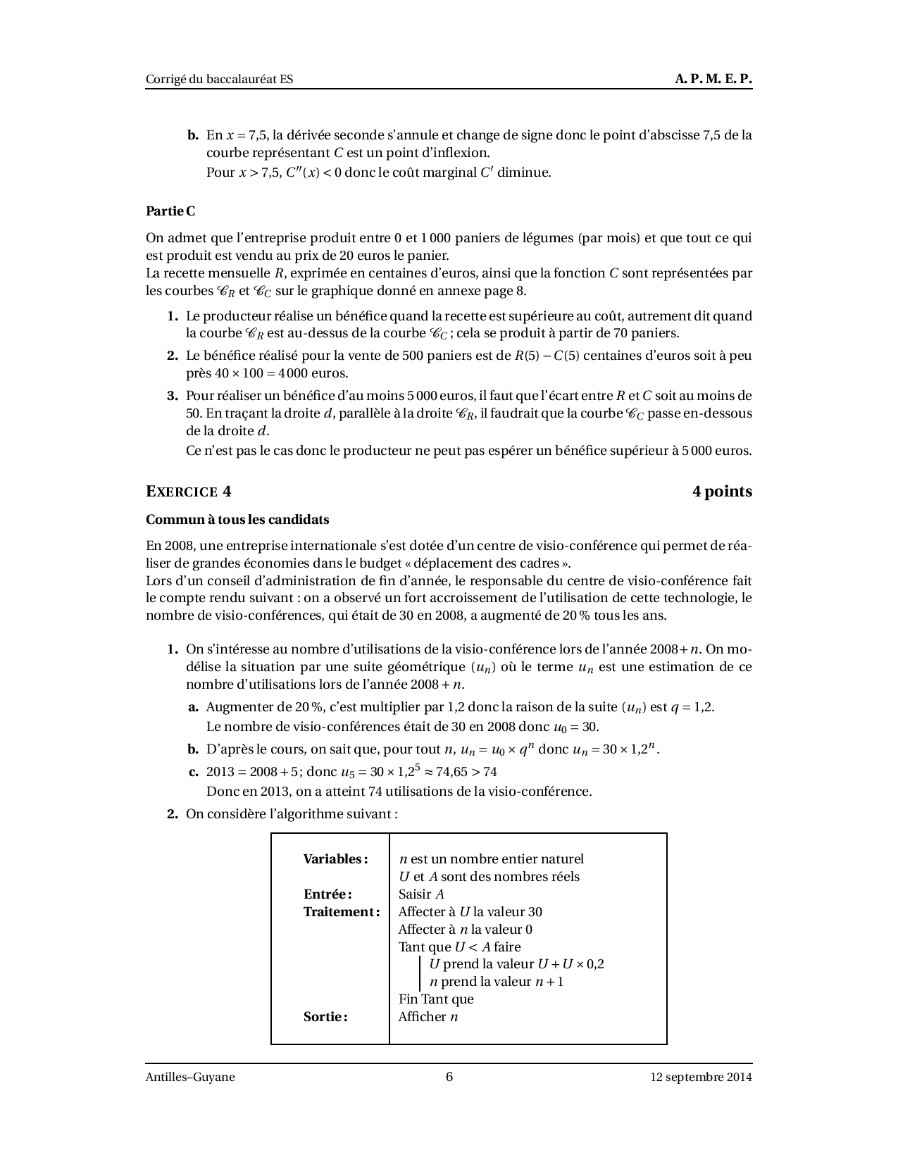 Annale Maths Bac ES-L Antilles-Guyane septembre 2014 - Corrigé