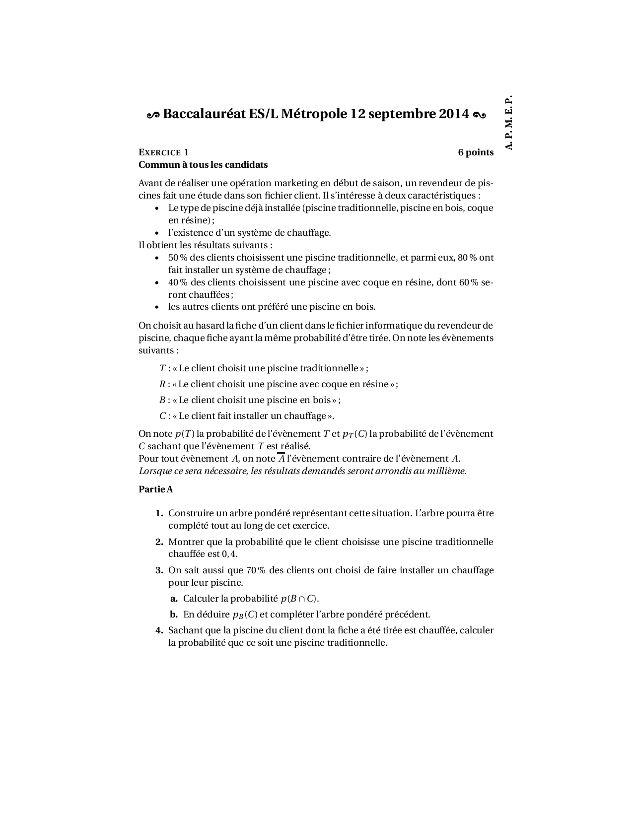 Annale Maths Bac ES-L Métropole septembre 2014 - Sujet