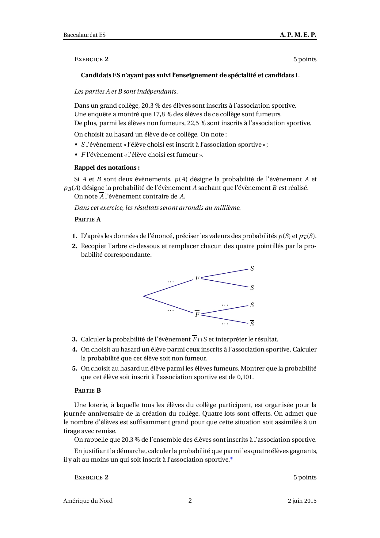 Annale Maths Bac ES-L Amérique du nord juin 2015 - Sujet