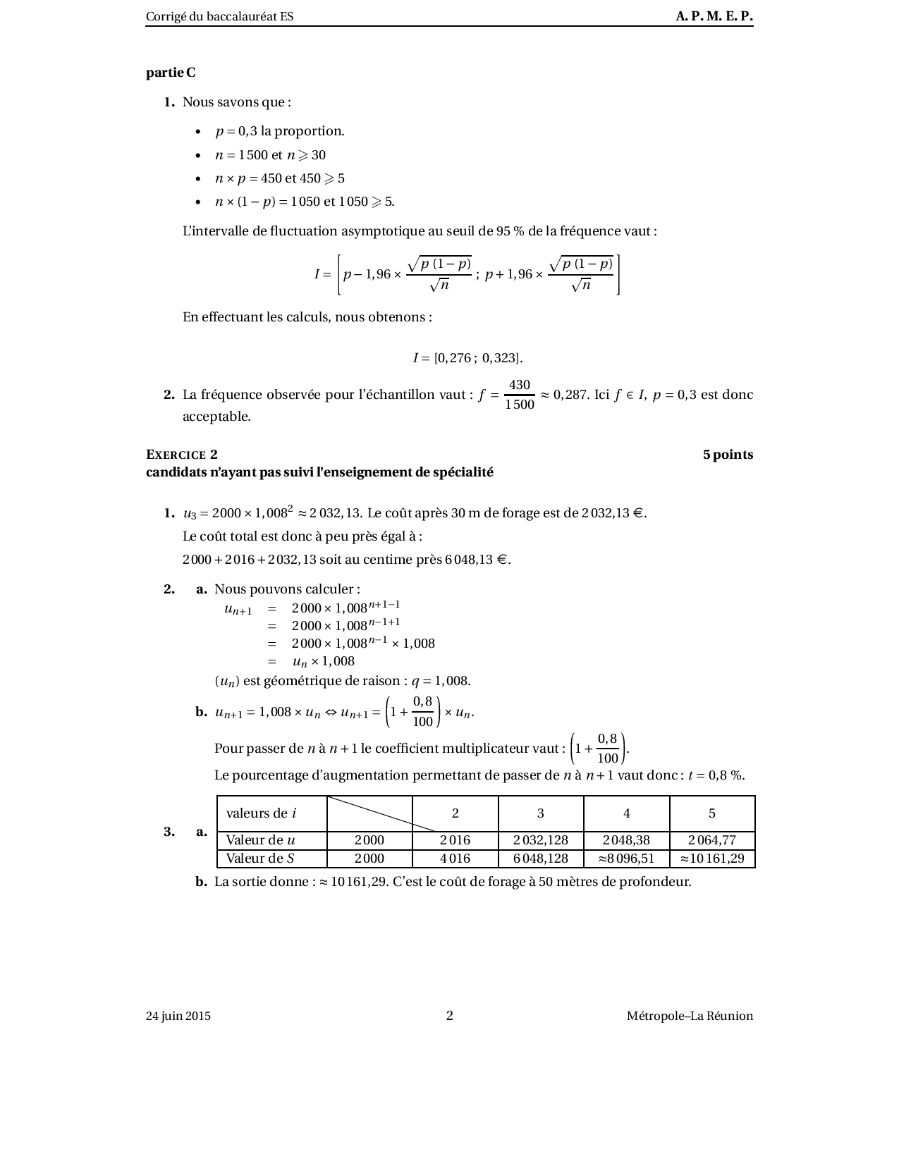 Annale Maths Bac ES-L Métropole juin 2015 - Corrigé