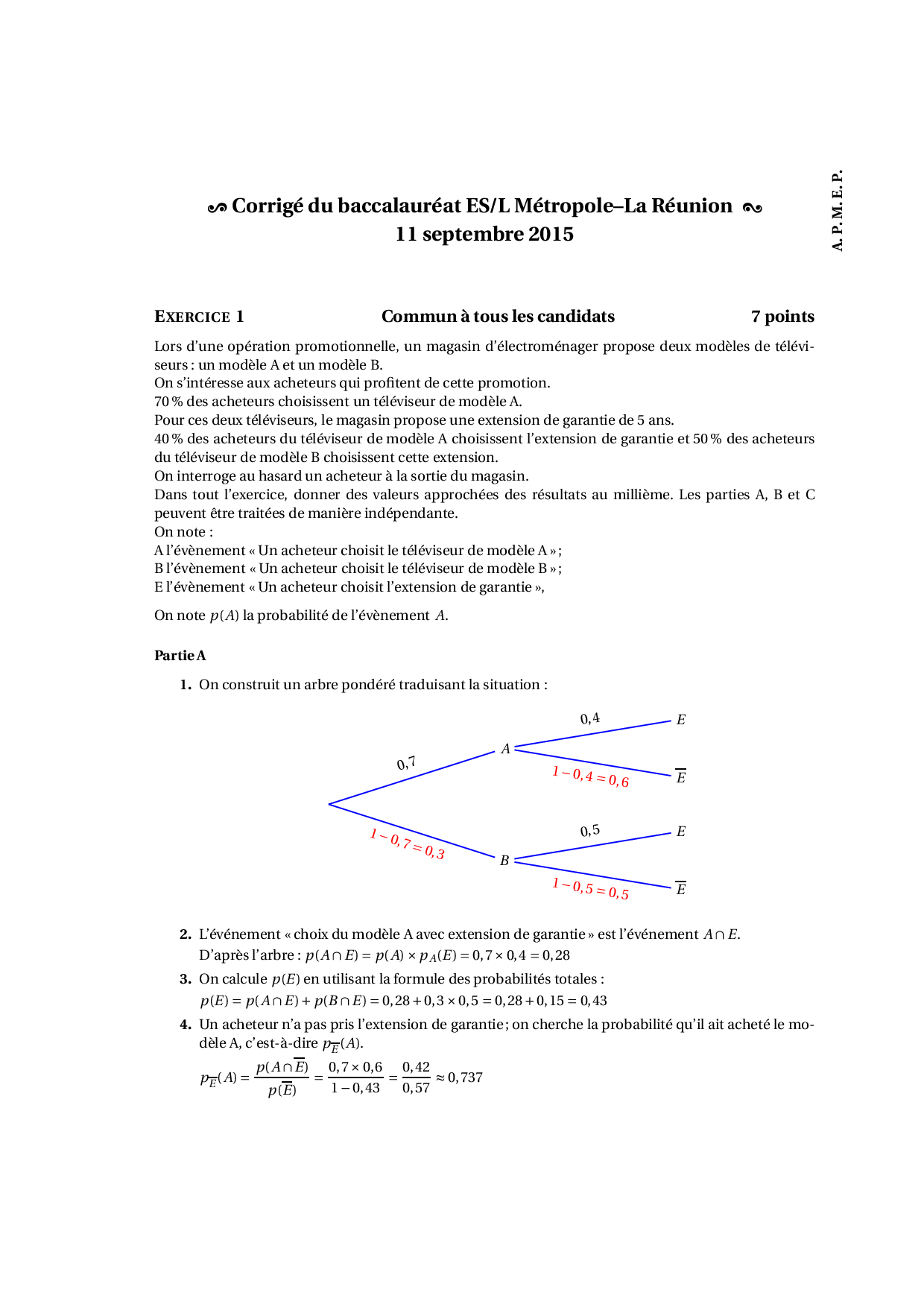 Annale Maths Bac ES-L Métropole septembre 2015 - Corrigé
