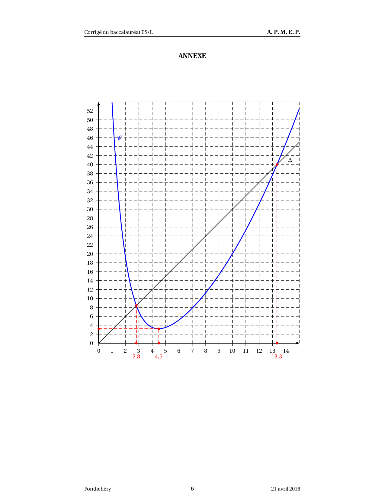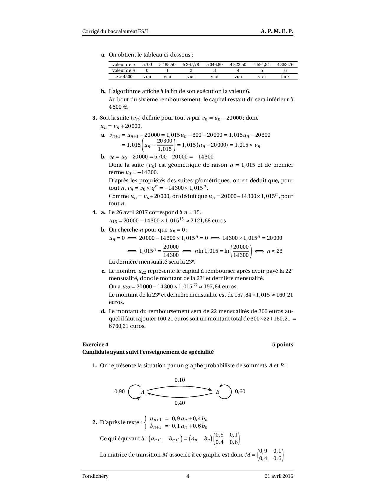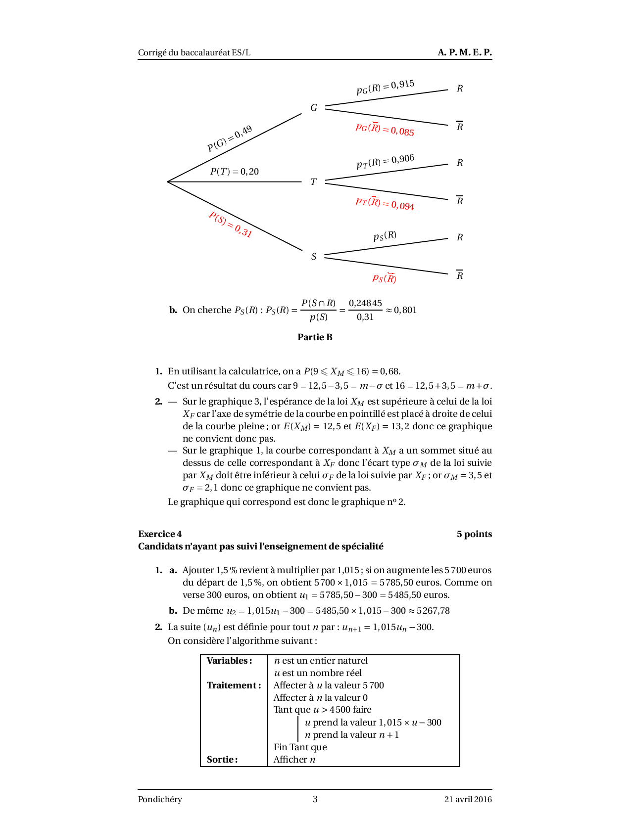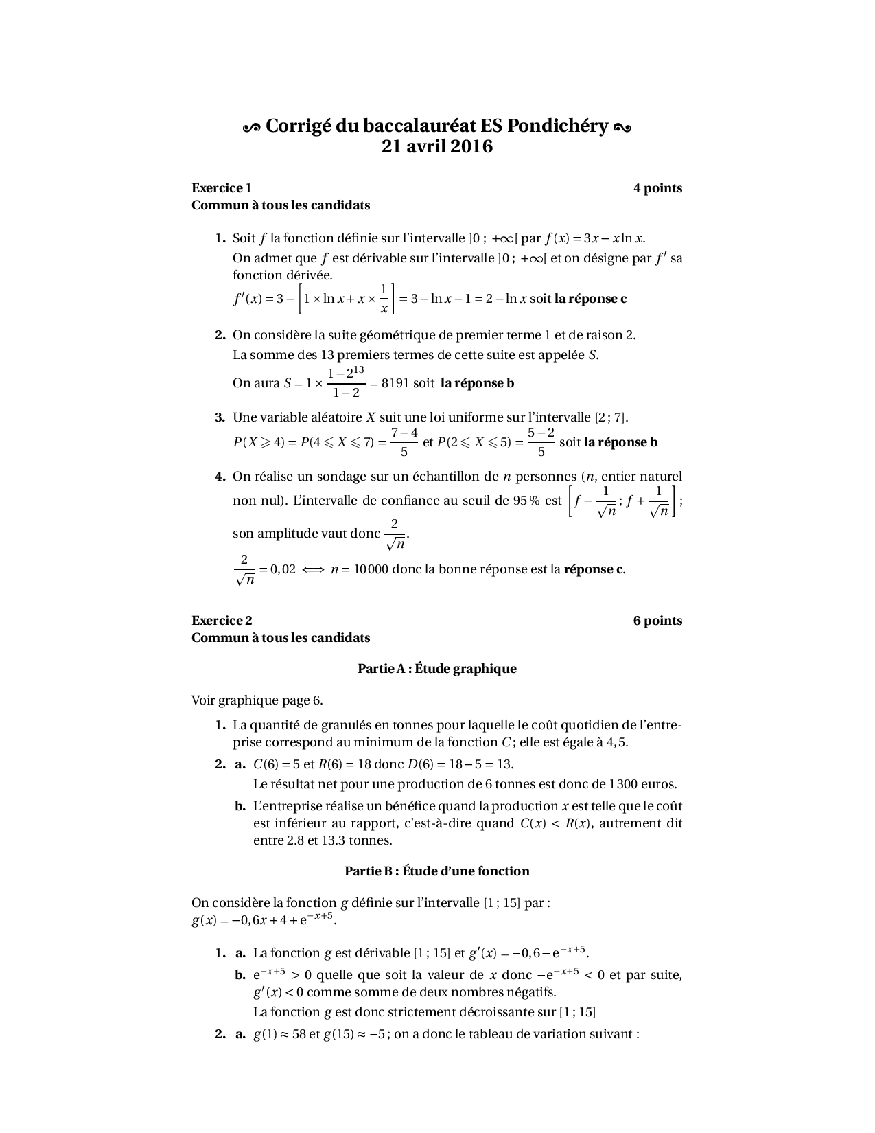 Annale Maths Bac ES-L Pondichéry avril 2016 - Corrigé