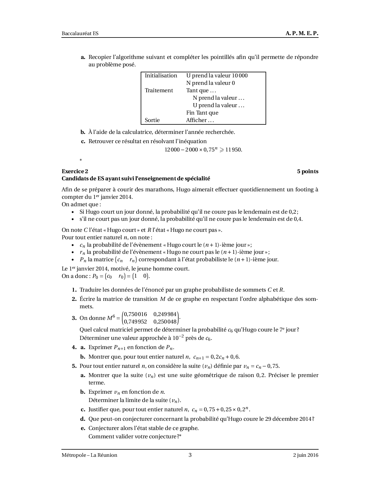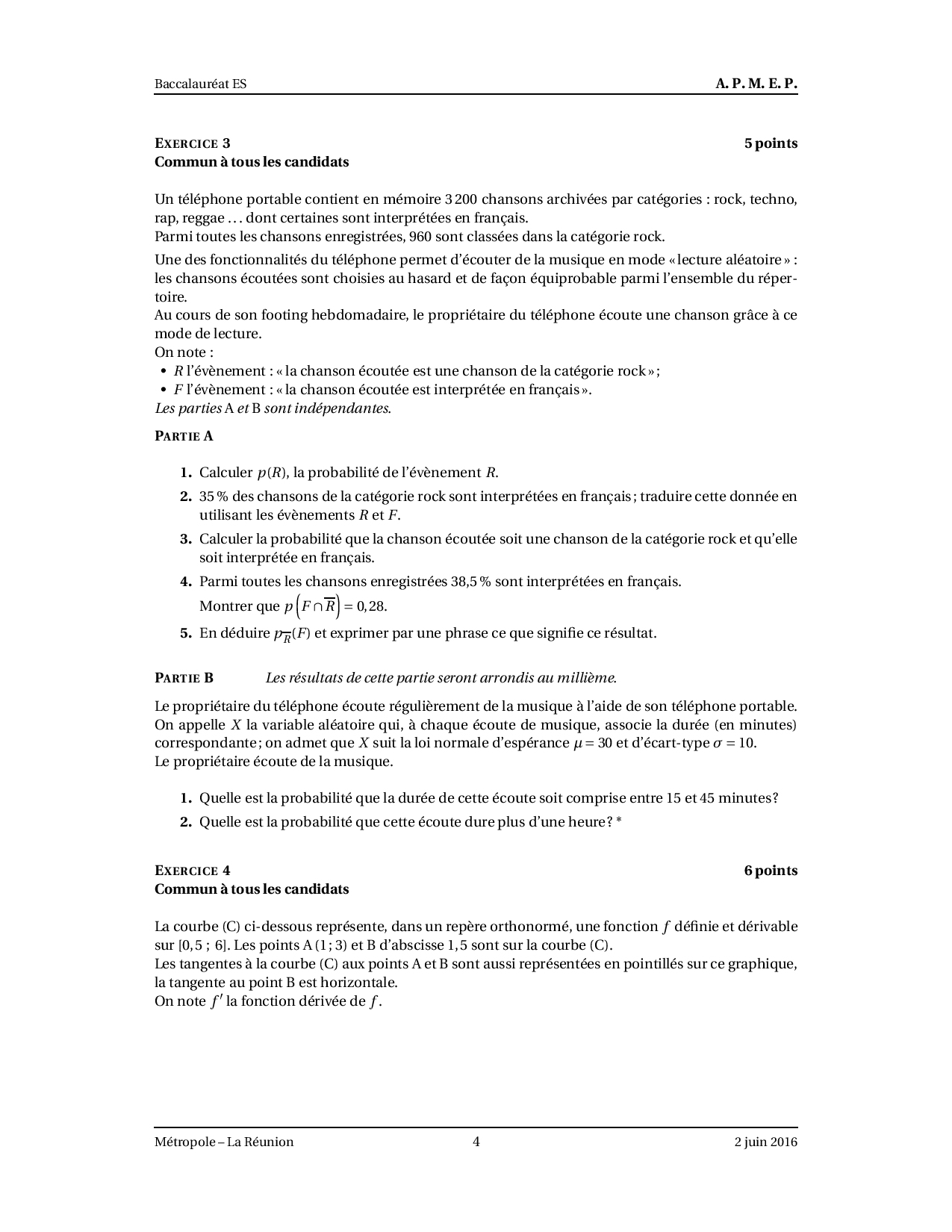 Annale Maths Bac ES-L Métropole juin 2016 - Sujet
