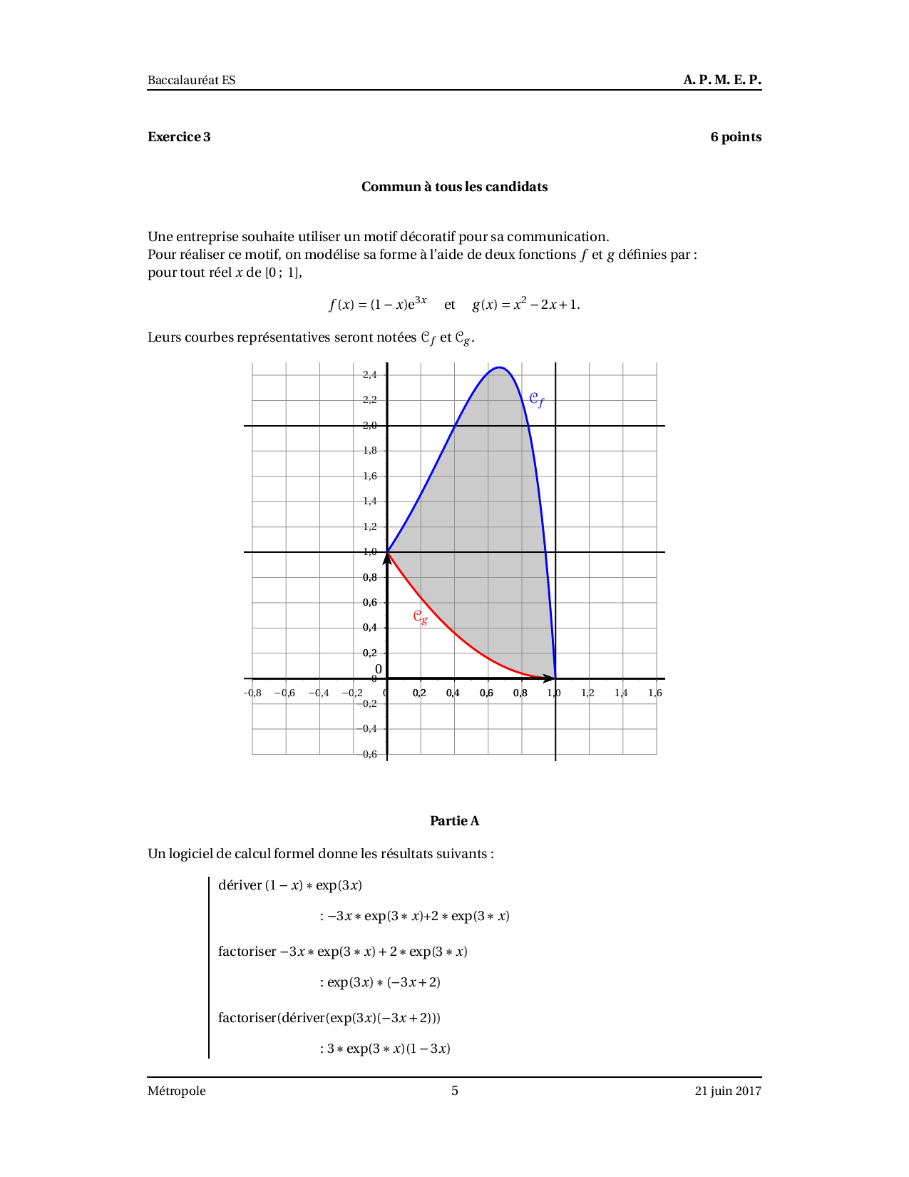 Annale Maths Bac ES-L Métropole juin 2017 - Sujet