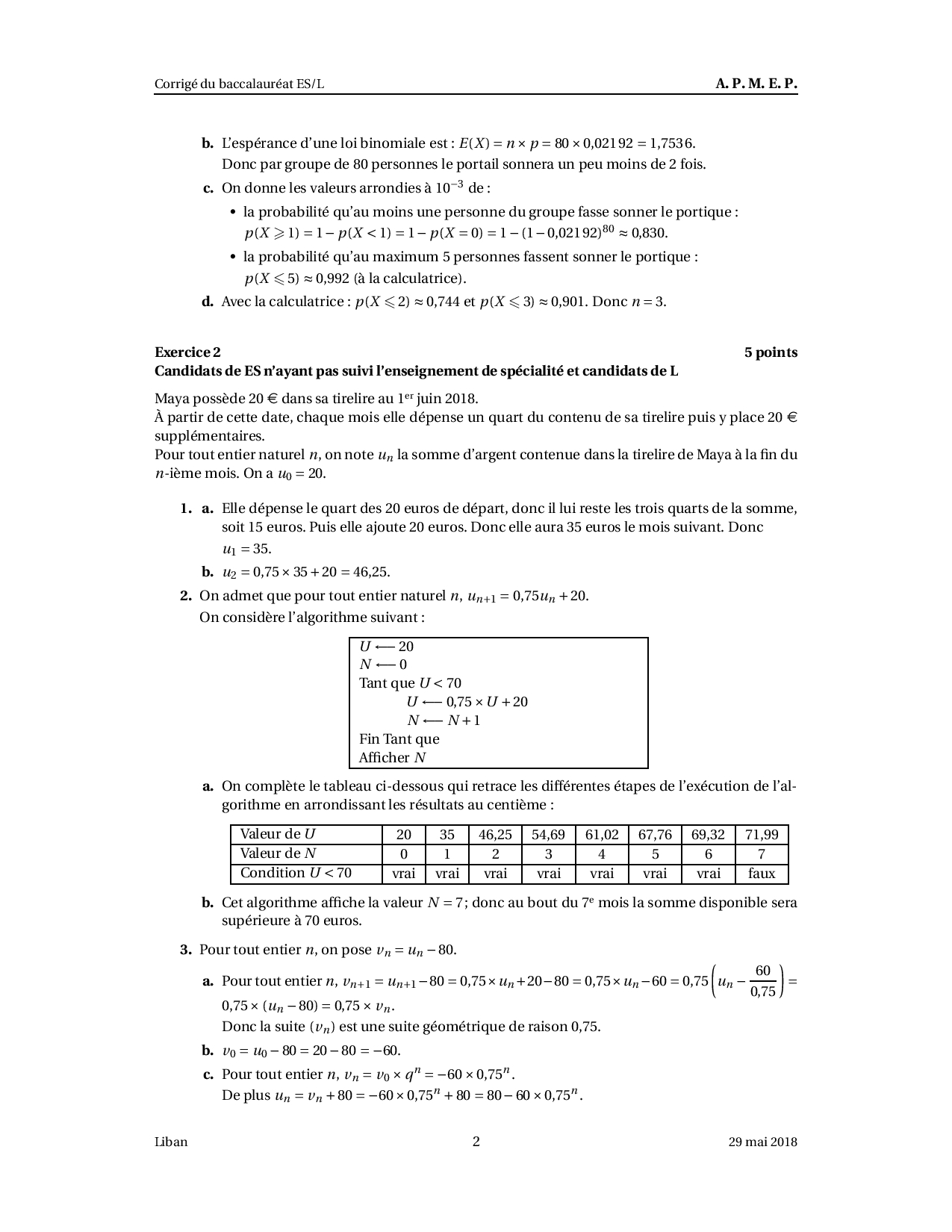 Annale Maths Bac ES-L Liban mai 2018 - Corrigé