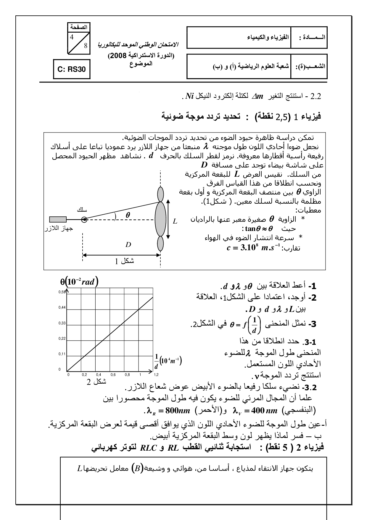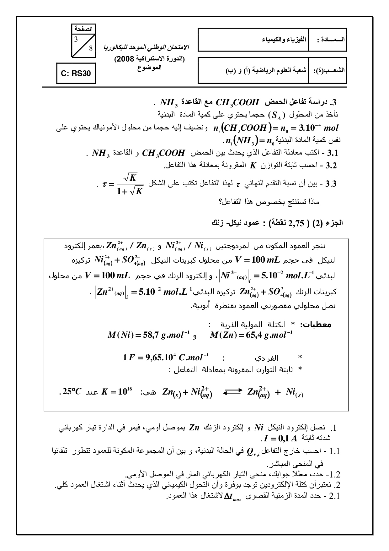 الفيزياء والكيمياء علوم رياضية 2008 الدورة الإستدراكية - الموضوع