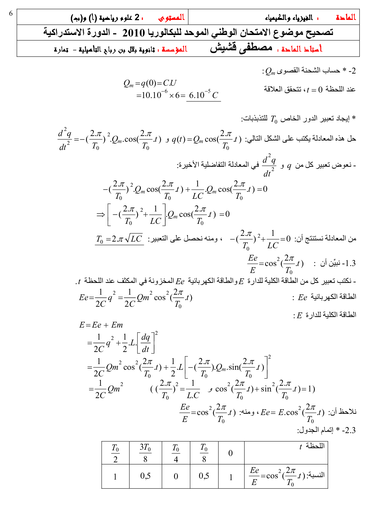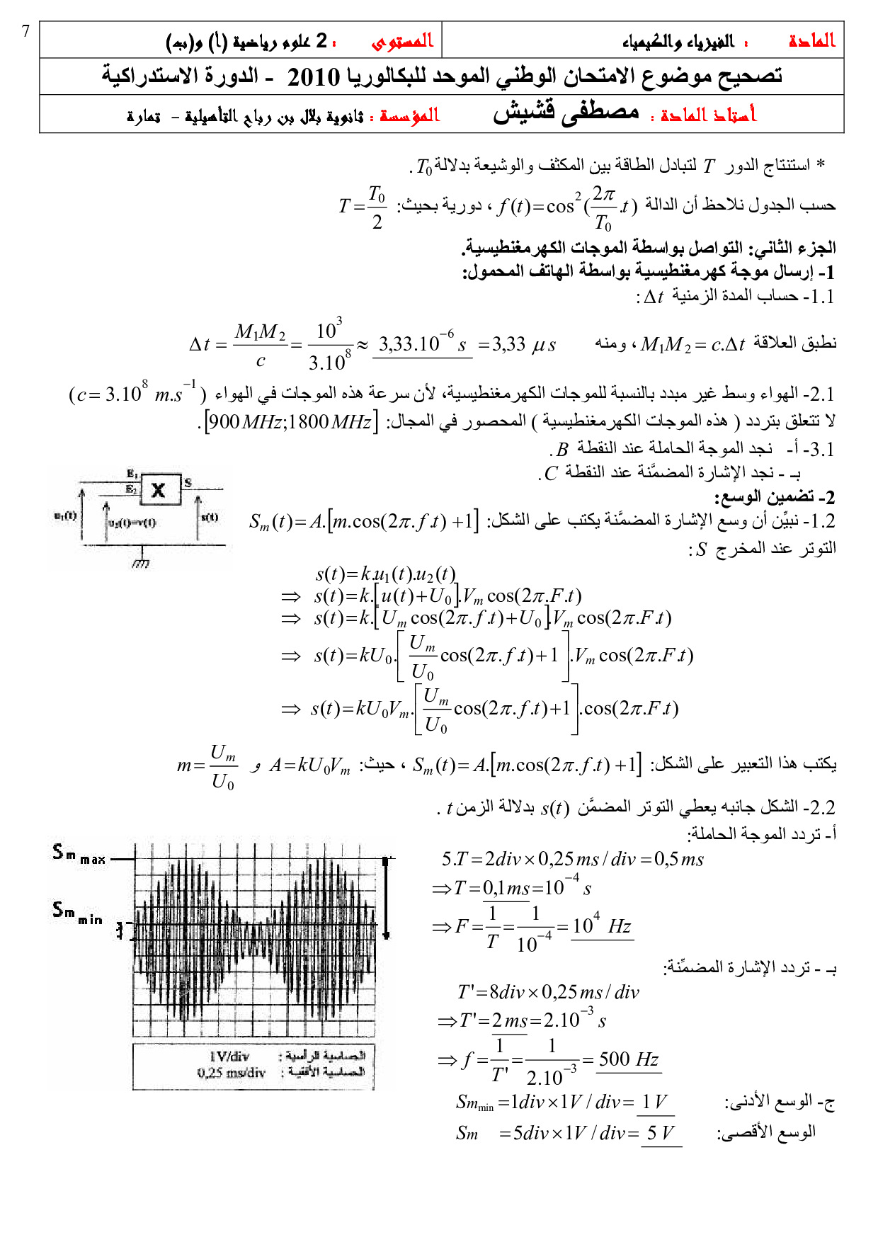 الفيزياء والكيمياء علوم رياضية 2010 الدورة الإستدراكية - التصحيح